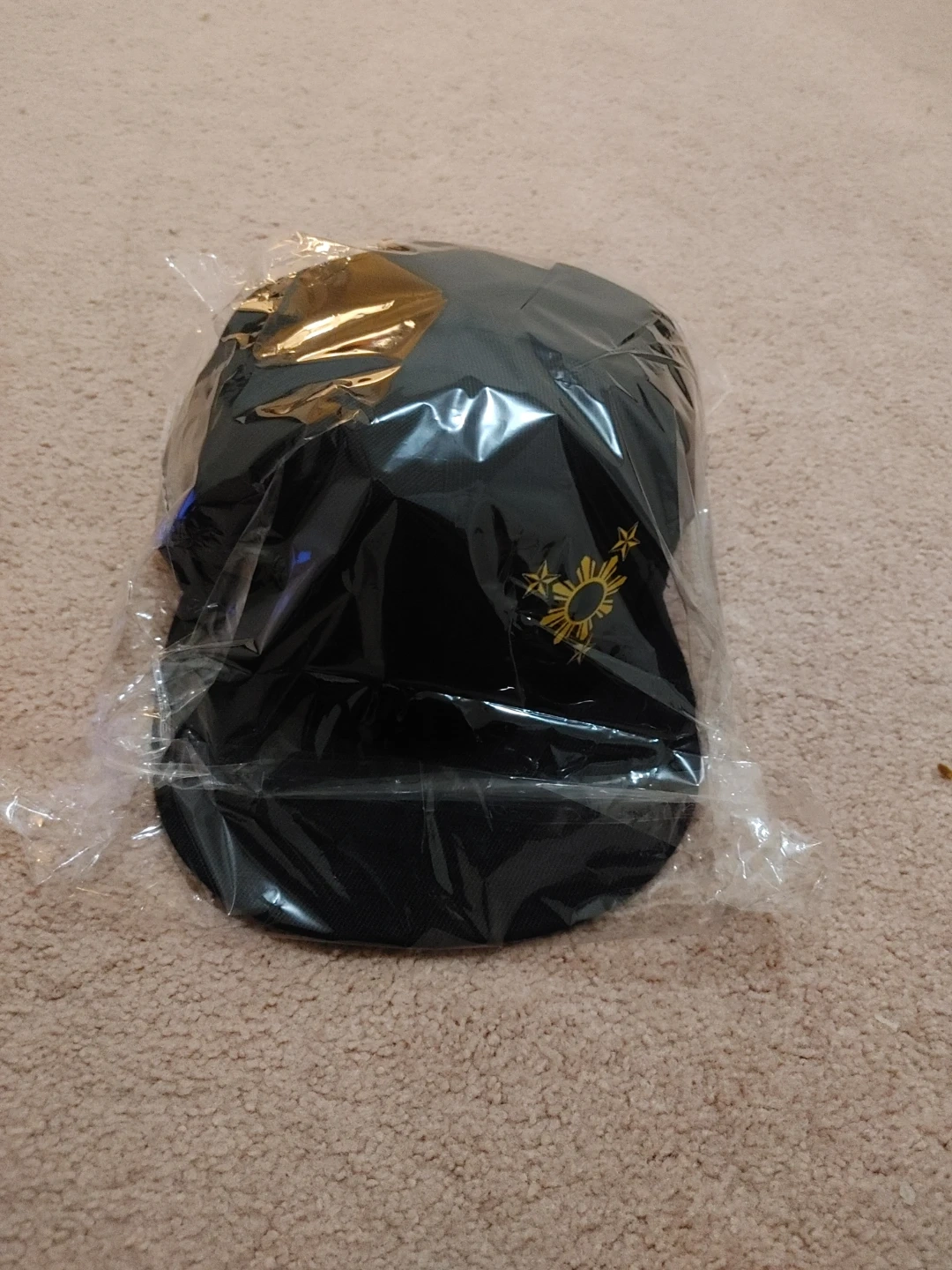 A black baseball cap featuring the Philippine sun emblem embroidered on the front. It's in a classic baseball cap style with a flat brim and structured crown. This cap is in new condition and still in its original plastic packaging.