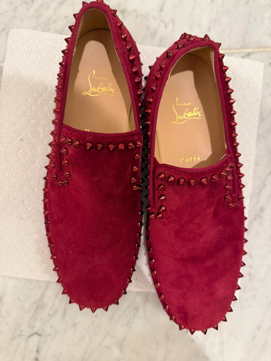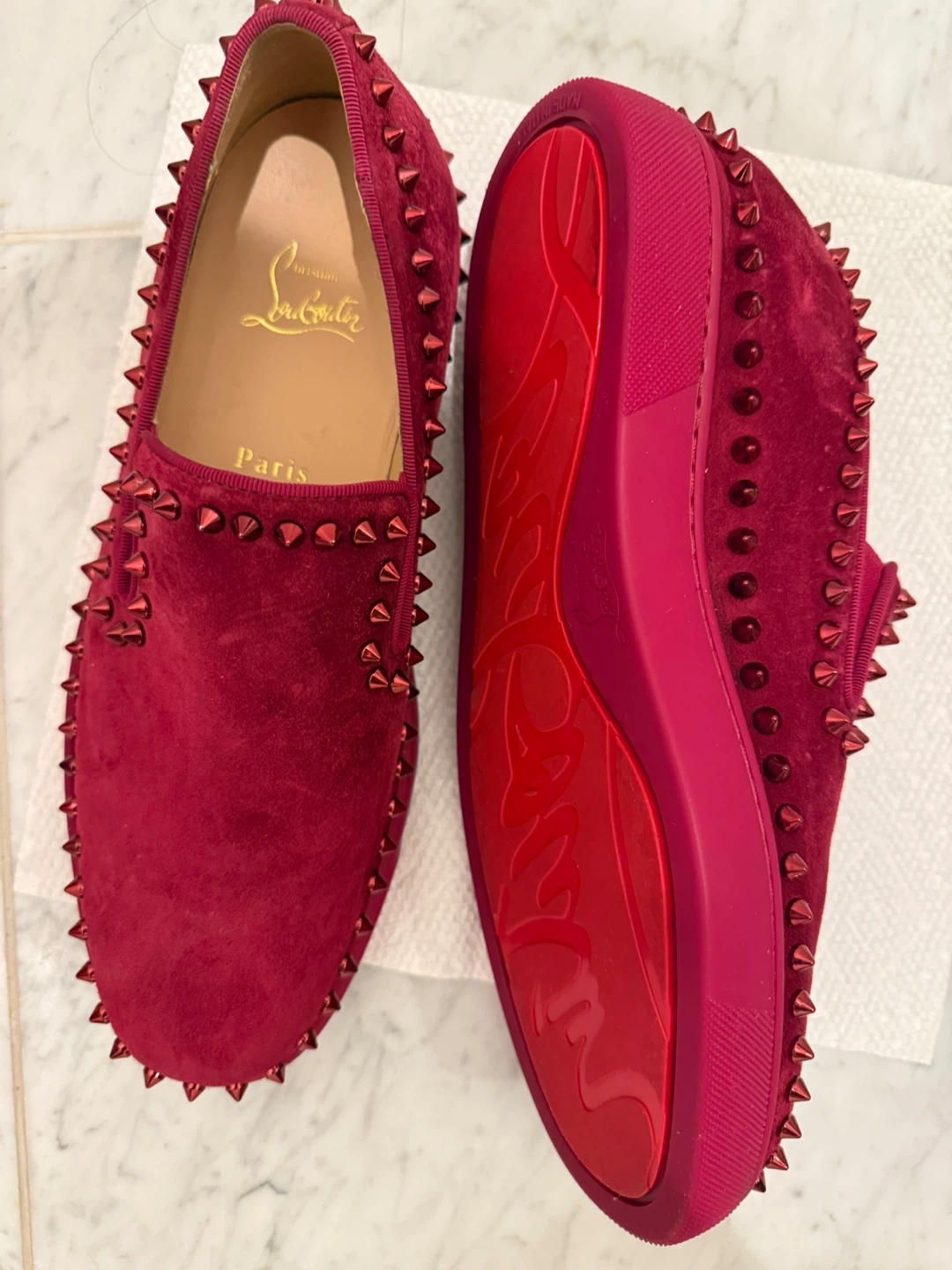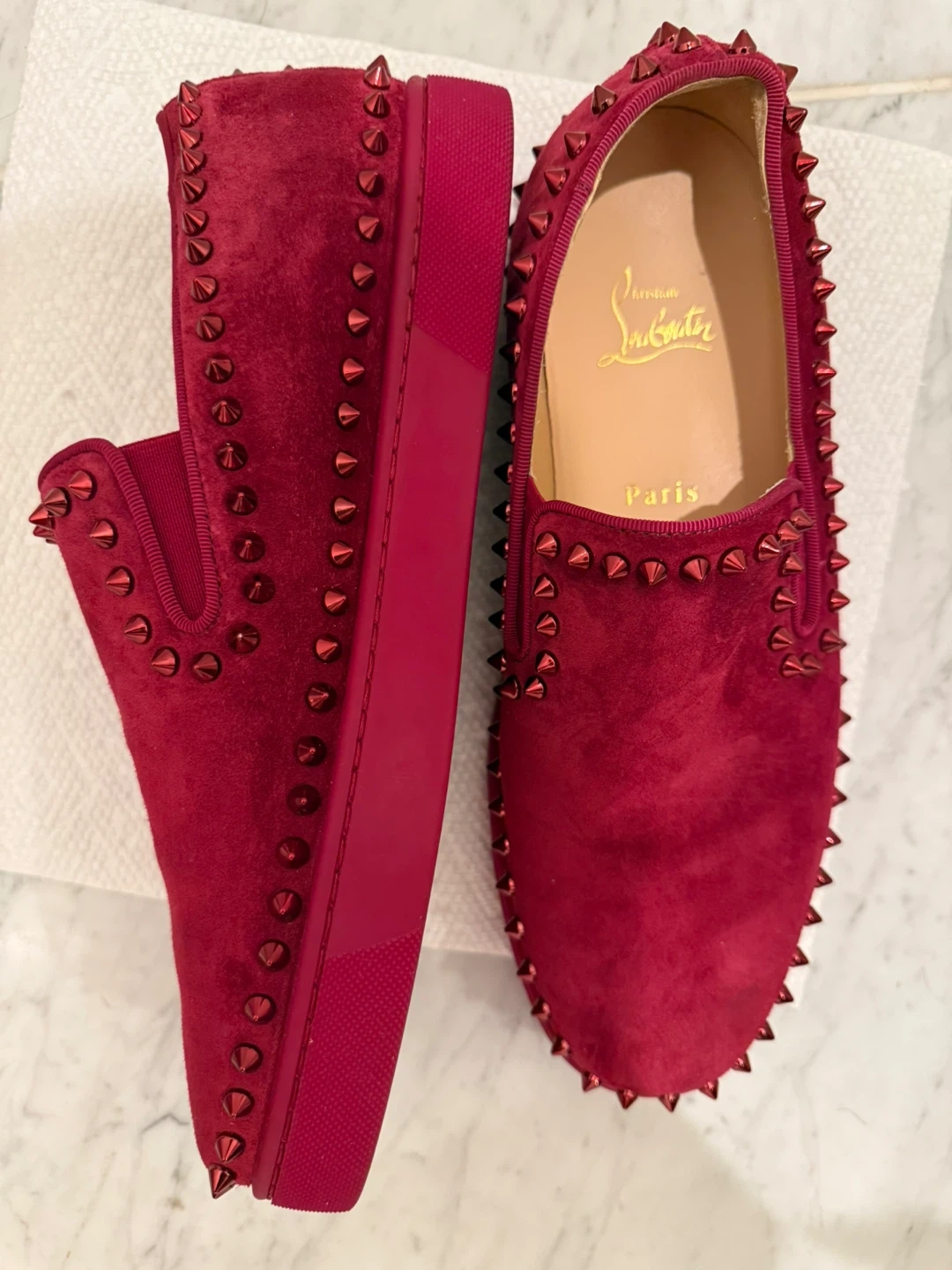 These Christian Louboutin loafers are made from red suede and feature signature spikes. They are a slip-on style with elastic side panels. The soles are a vibrant pinkish-red hue.