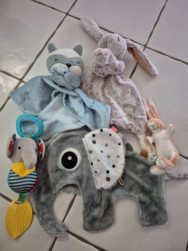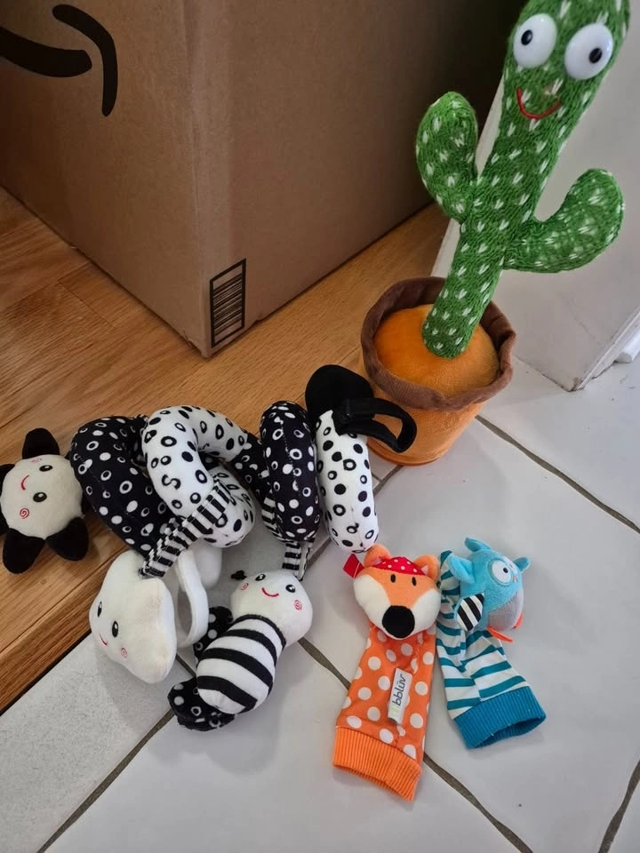 Large bundle of baby plush toys, soft books, and activity toys. Includes comfort loveys, black-and-white sensory plush for a stroller or car seat, soft fabric books, foot finders, an activity ball, a dancing cactus, and a crawling crab. From a clean, pet-free and smoke-free home. Pickup preferred near Brock University. Only selling as a lot. If it's listed, it's available. Cash or etransfer.