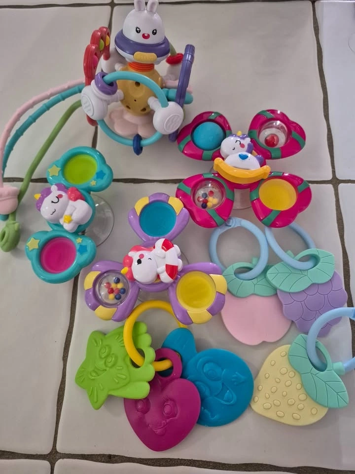 Large lot of modern silicone teethers and sensory toys. Includes pacifier and stroller clips, spinners, teething mits, activity boards for tummy time, and pacifier containers. From a clean, pet-free and smoke-free home. Great for teething, sensory play, and early development. Pickup preferred (near Brock University). Only selling as a lot. If it's listed, it's available. Cash or etransfer.