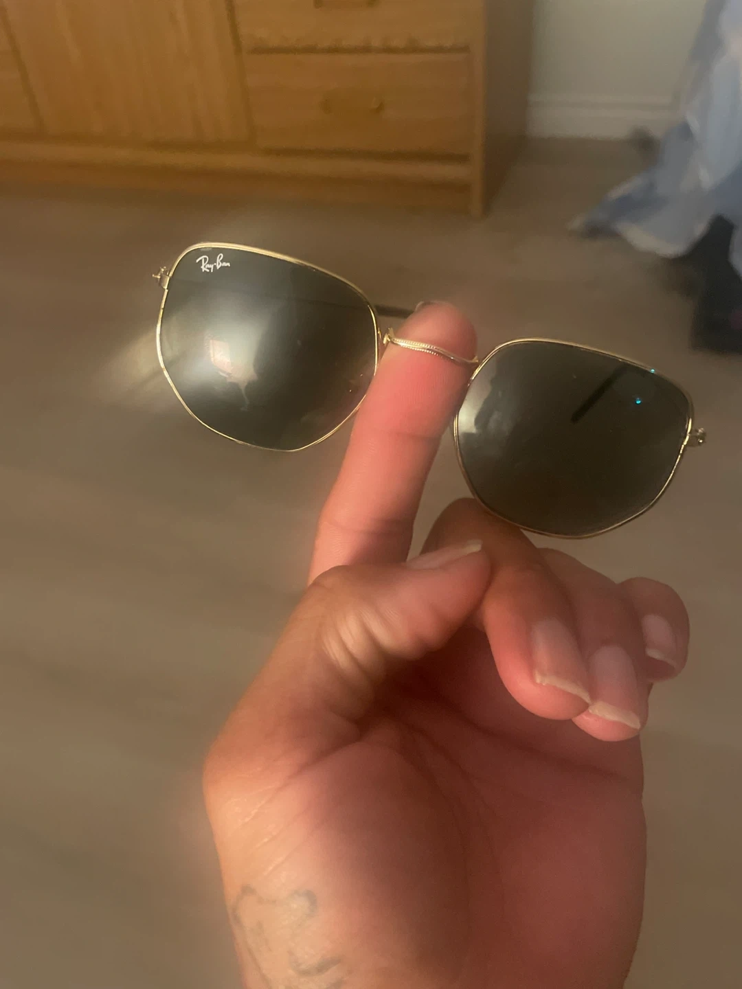 Ray-Ban sunglasses with a gold frame and dark lenses. These shades offer classic style and sun protection. Perfect for sunny days!