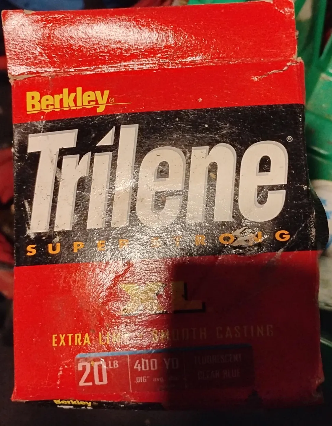 Berkley Trilene fishing line. It's 20 LB test and 400 yards long. The line is fluorescent clear blue and designed for smooth casting. This line is useful for anglers needing strong, visible line for their fishing trips.