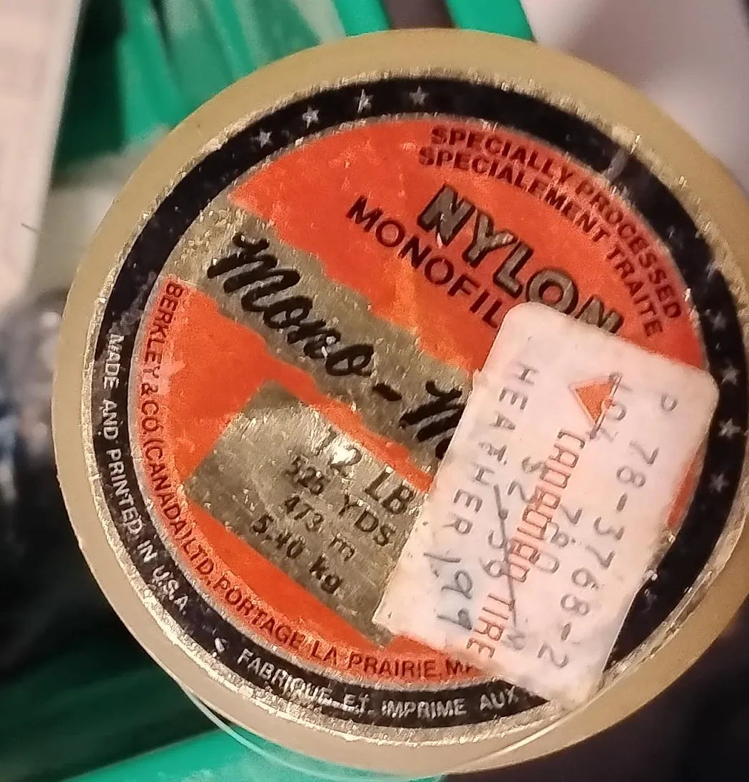 Berkley "Mono-" nylon monofilament fishing line. This is specially processed and specially treated. It's 12 LB test with 525 yards or 473 meters. The line is made and printed in the U.S.A.