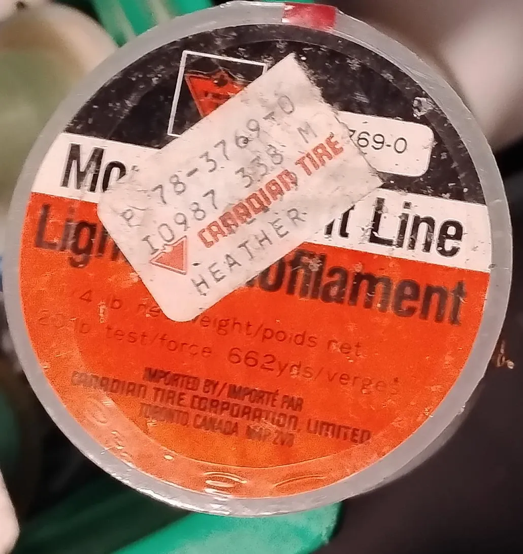 Canadian Tire Heather Monofilament fishing line. It's 662 yards long and has a 20 lb test/force rating. This line is imported by Canadian Tire Corporation.
