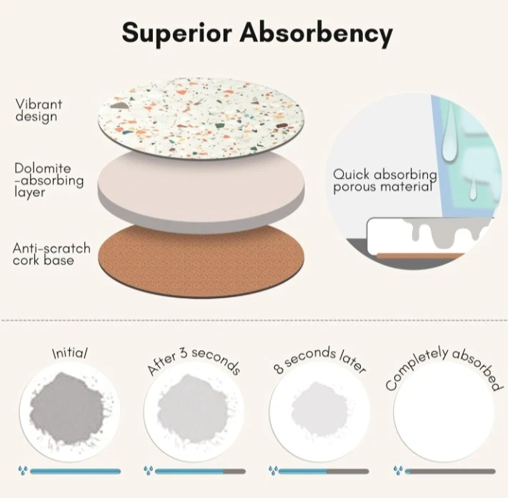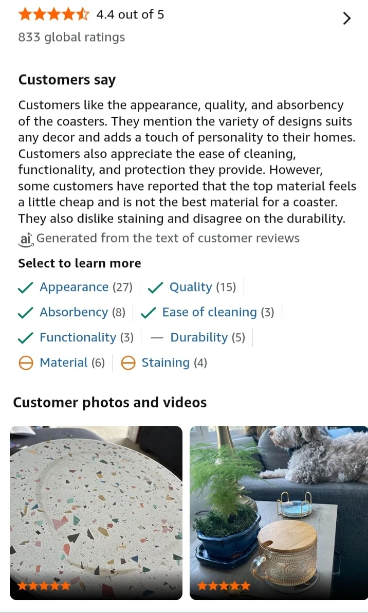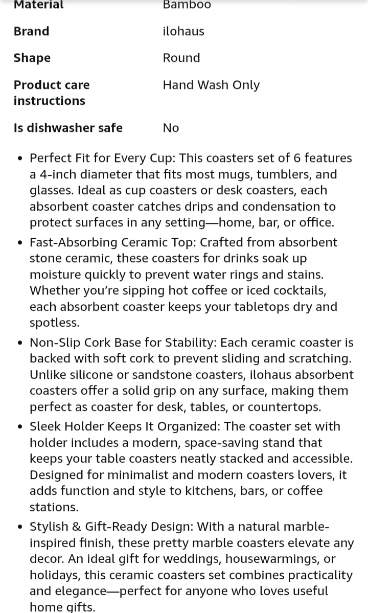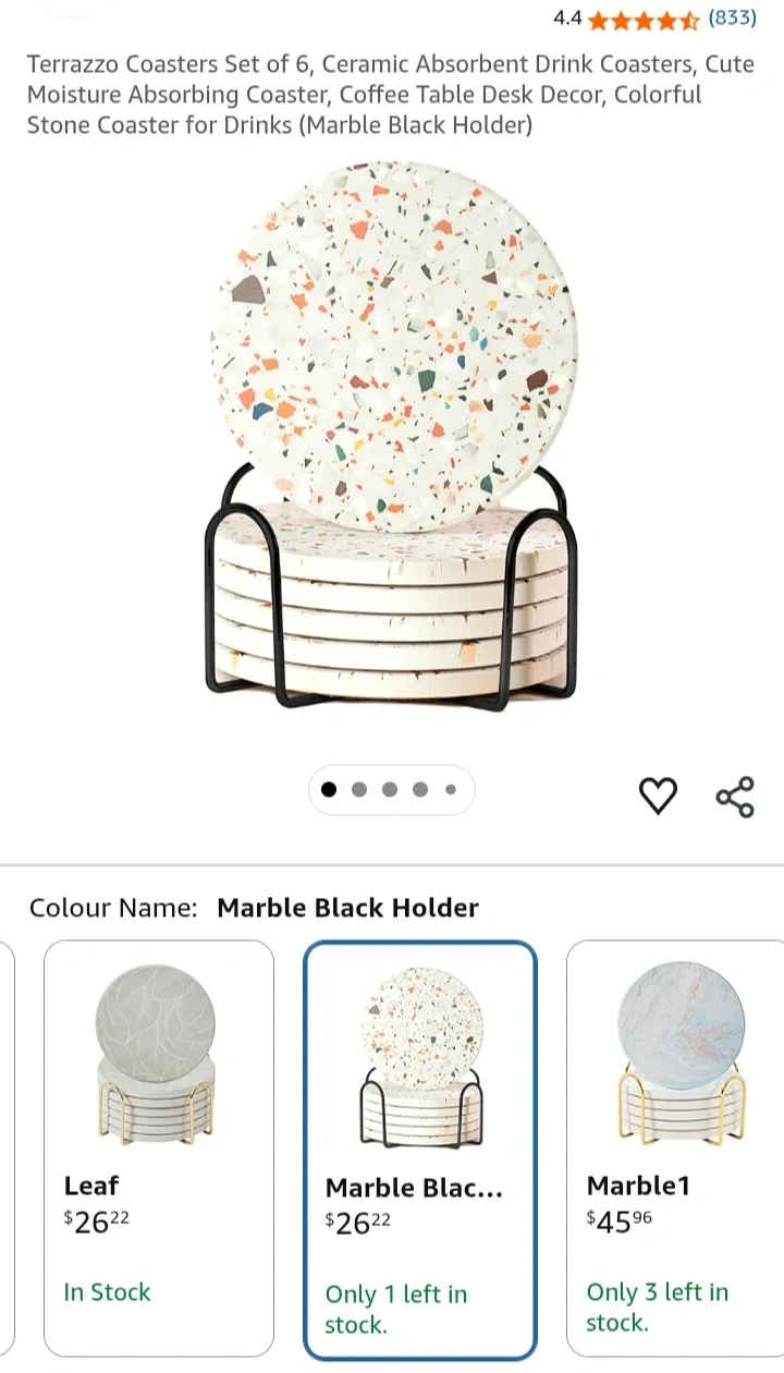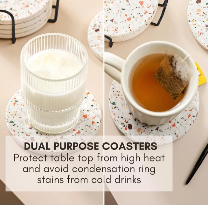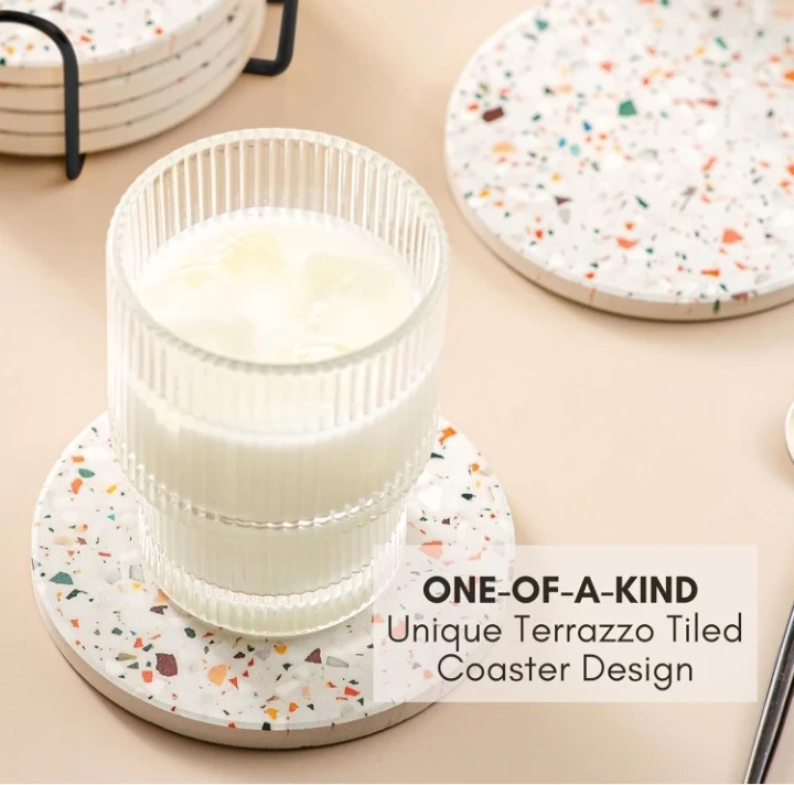Protect your tables with this set of six absorbent ceramic coasters featuring a unique terrazzo design. It's moisture-absorbing and comes with a stylish black holder. They're great for preventing condensation rings from cold drinks and heat stains from hot beverages!