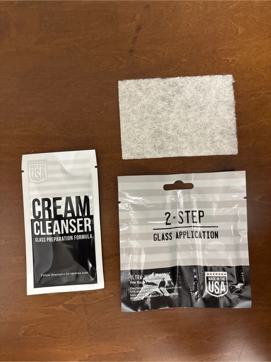 This is a Glassparency windshield kit. It includes a Glass & Chrome cleaner, a Glass cleaner, a Boost multi-use sealant, and a 2-step glass application package with cream cleanser and with 4 applicator pads. Great for rainy commutes, clear visibility, rain slides off in beads, easy application. Products are made in the USA.