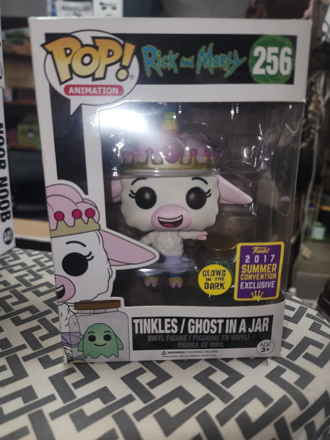 This is the Funko Pop! Animation vinyl figure of Tinkles from Rick and Morty. It's a 2017 Summer Convention Exclusive that glows in the dark! This collectible is recommended for ages 3 and up.
