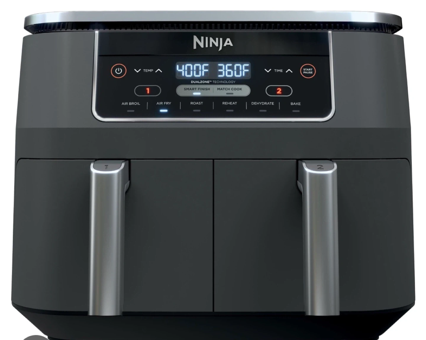 Ninja DualZone air fryer with two baskets. Features include Air Broil, Air Fry, Roast, Reheat, Dehydrate, and Bake settings. Smart Finish and Match Cook options are available.