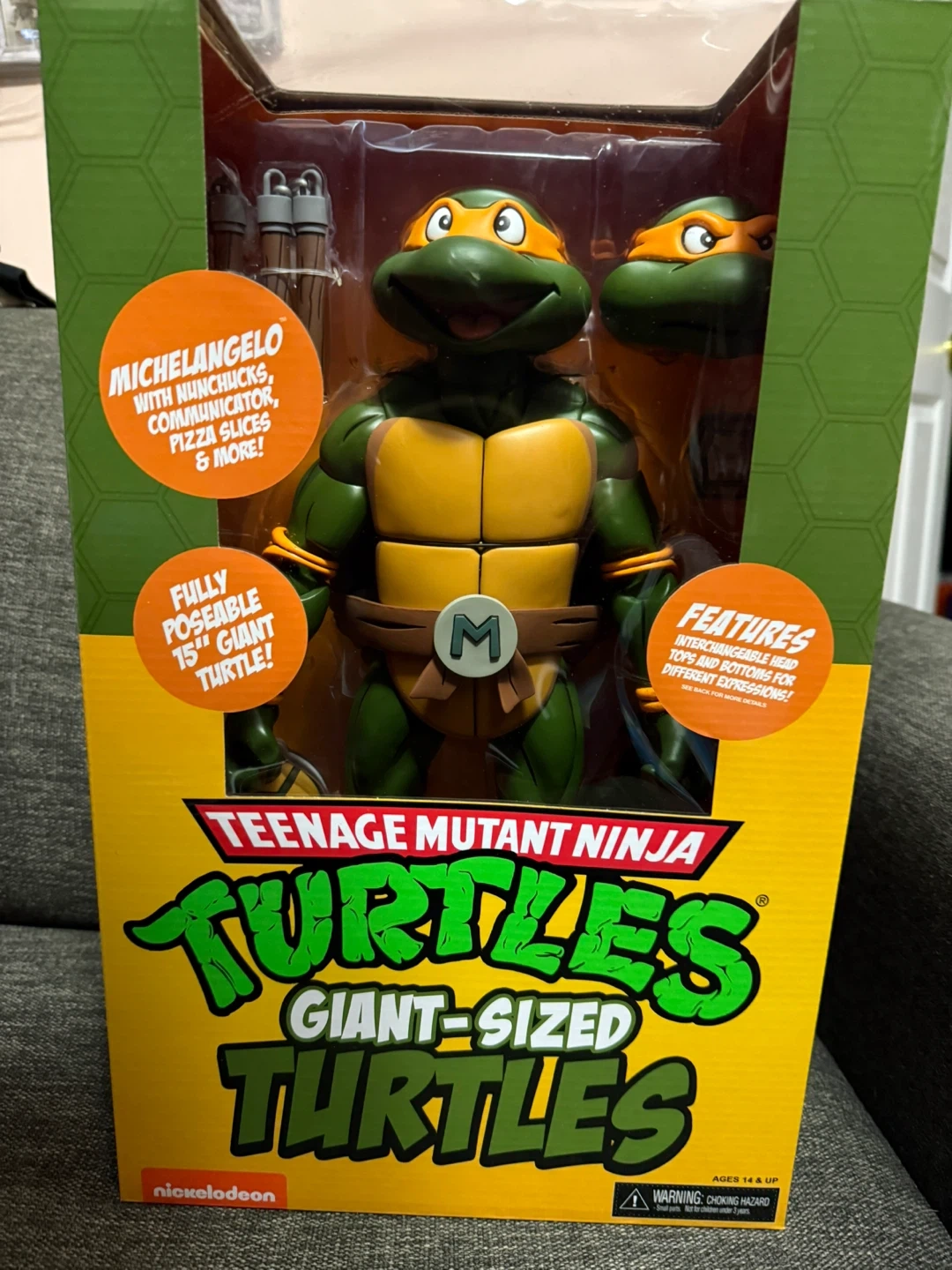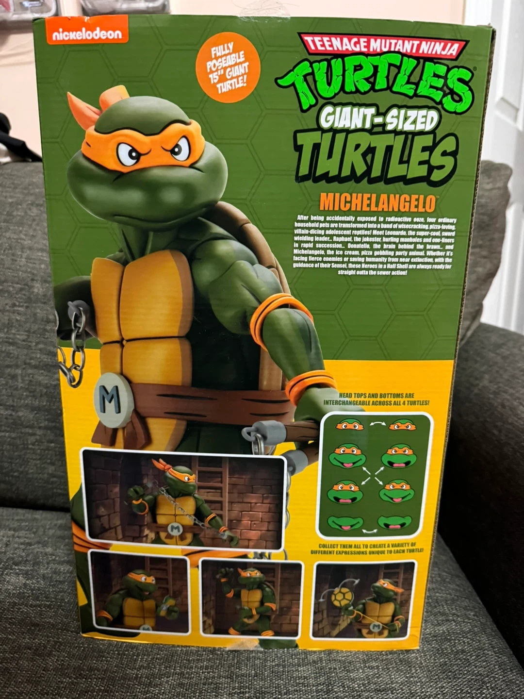 This is a 15" fully poseable Michelangelo action figure from Teenage Mutant Ninja Turtles Giant-Sized Turtles line. It includes interchangeable heads and bottom torsos for creating various expressions. This figure is great for collectors and fans of the TMNT franchise!