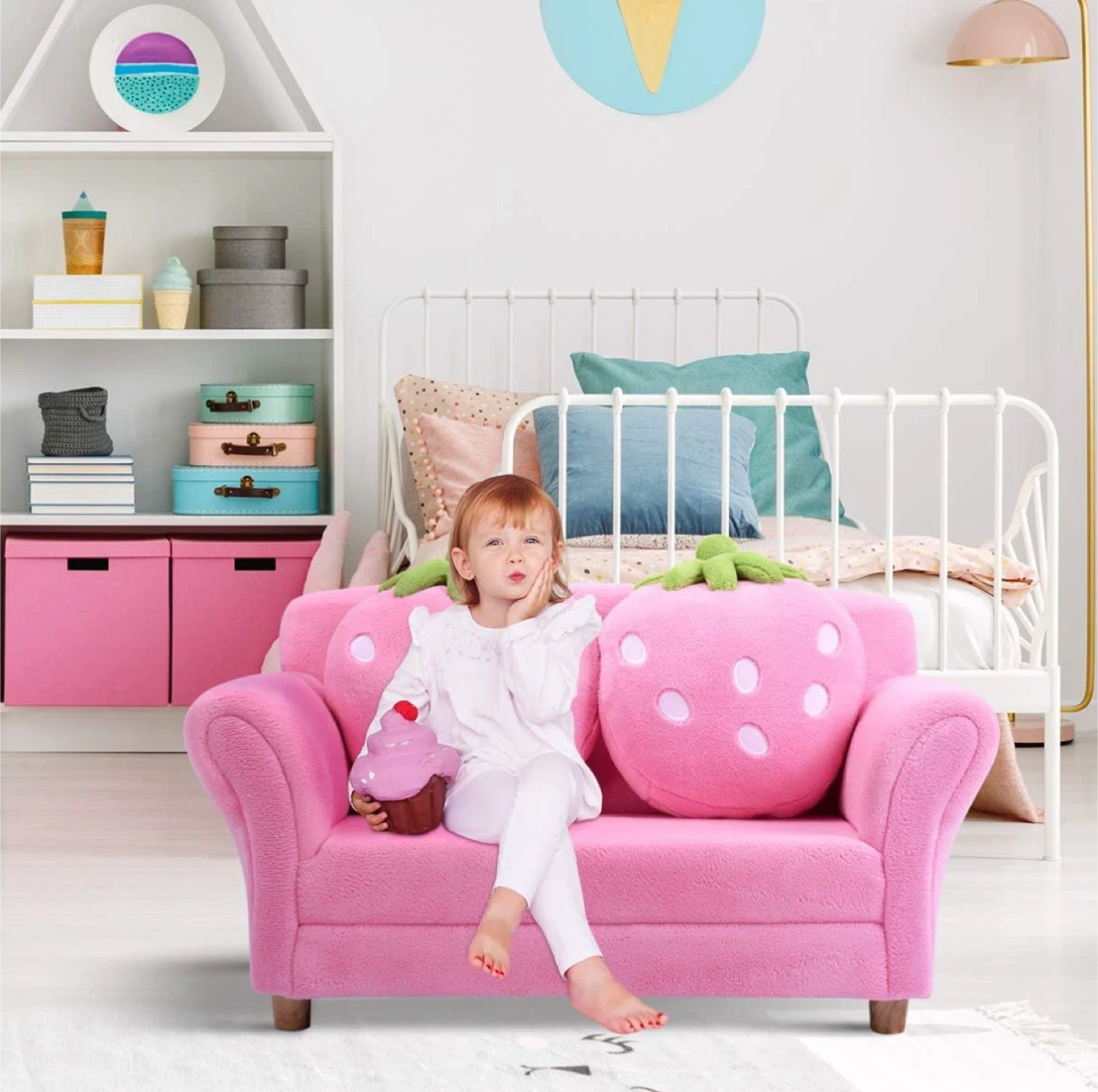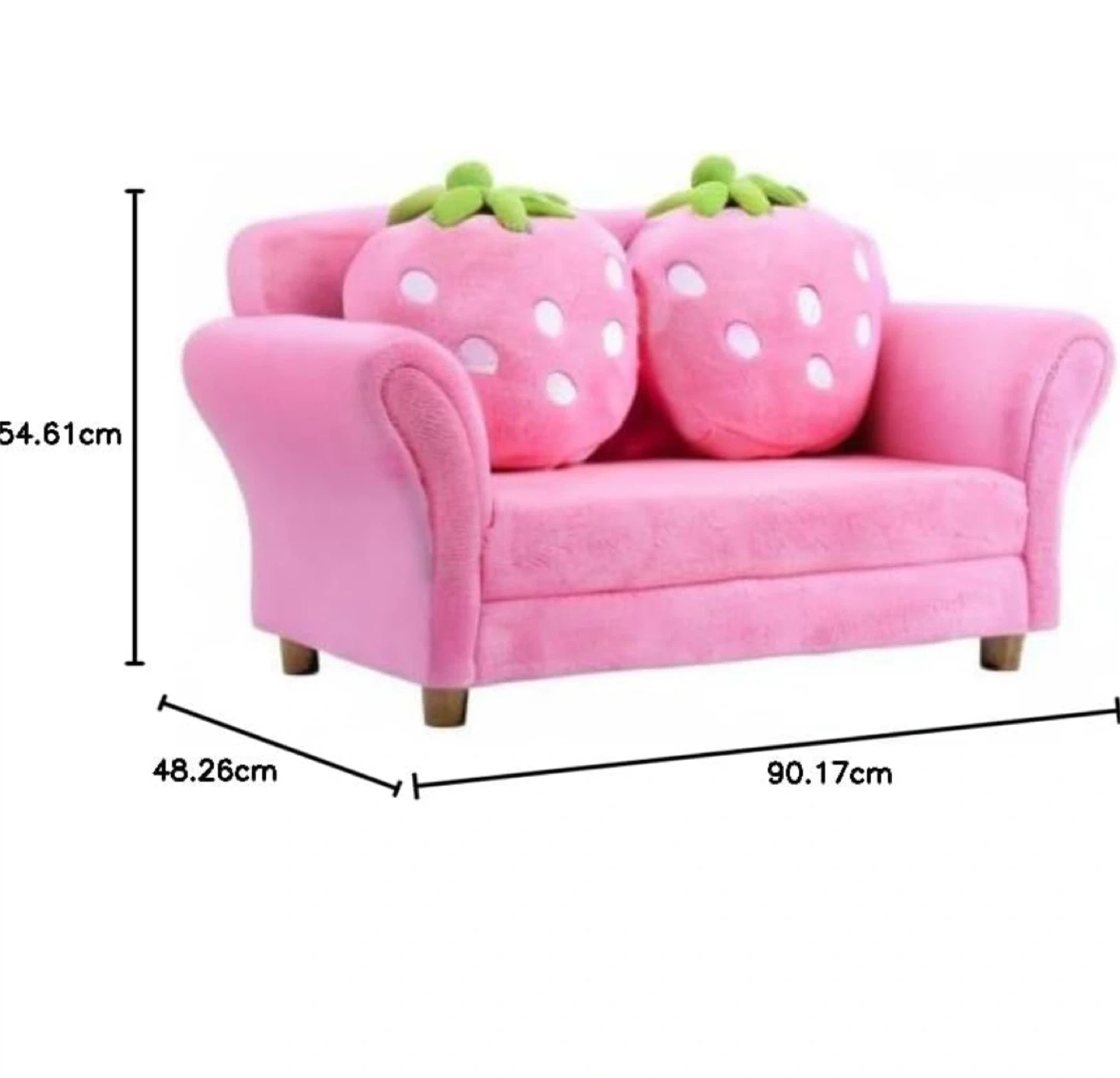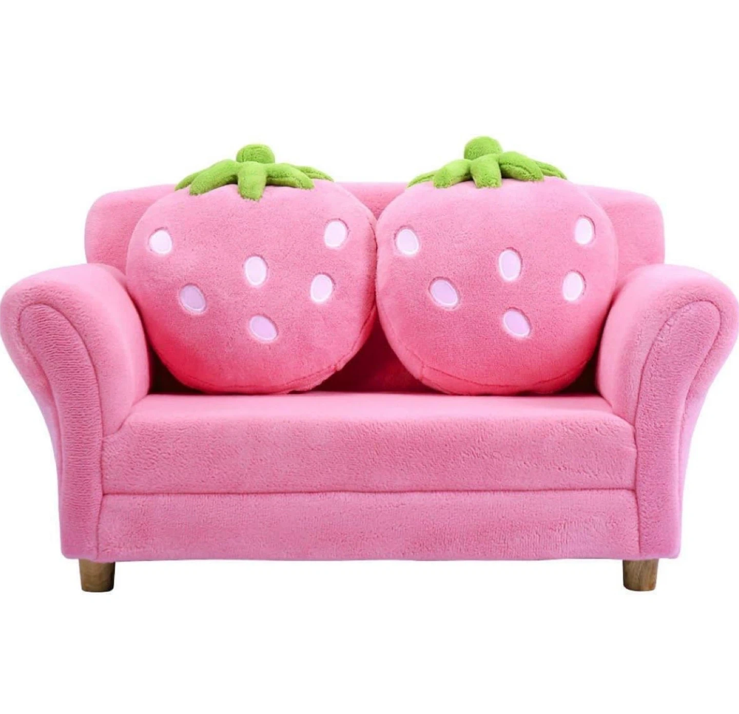 This adorable pink kids sofa features two strawberry-shaped pillows! It's upholstered in a soft, plush material, perfect for little ones. Dimensions: 90.17cm wide, 48.26cm deep, and 54.61cm high. Great for a child's playroom or bedroom!