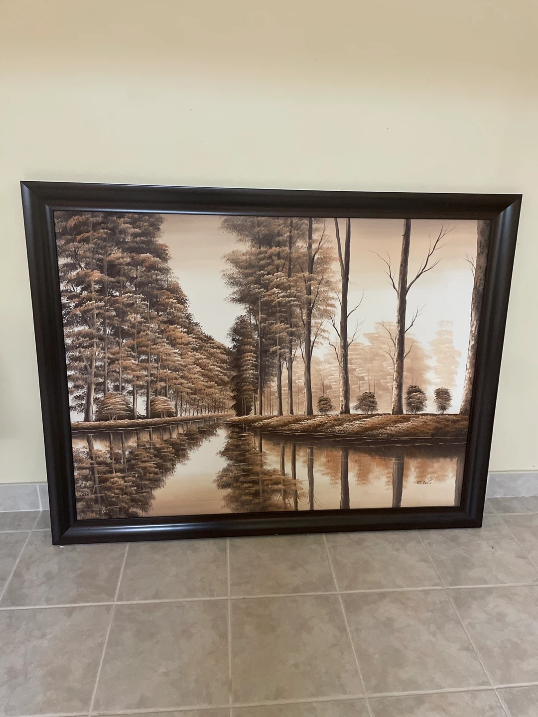 This framed painting depicts a serene forest scene with a reflective body of water. It's a beautiful piece to add to your home decor. The art features a detailed rendering of trees and natural light.