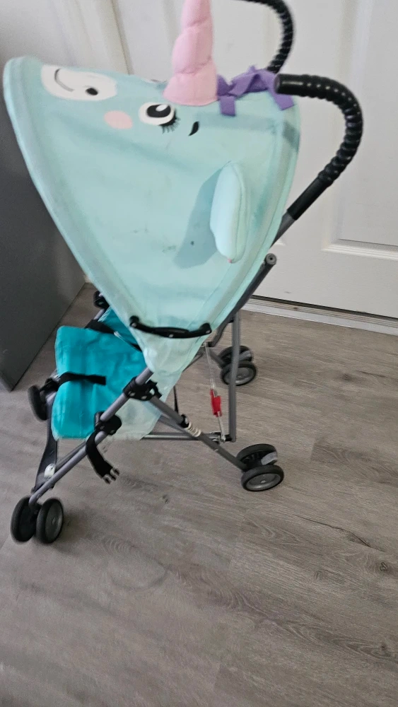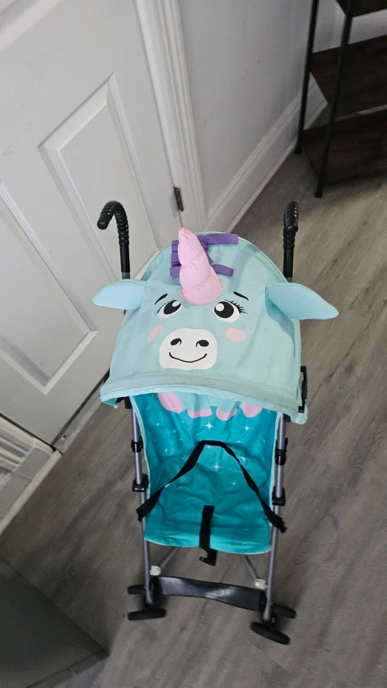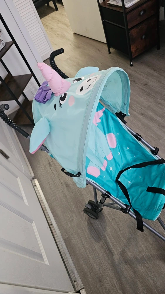 Lightweight umbrella stroller with a fun unicorn design! It features a canopy and safety straps for your little one. Perfect for quick trips and travel.