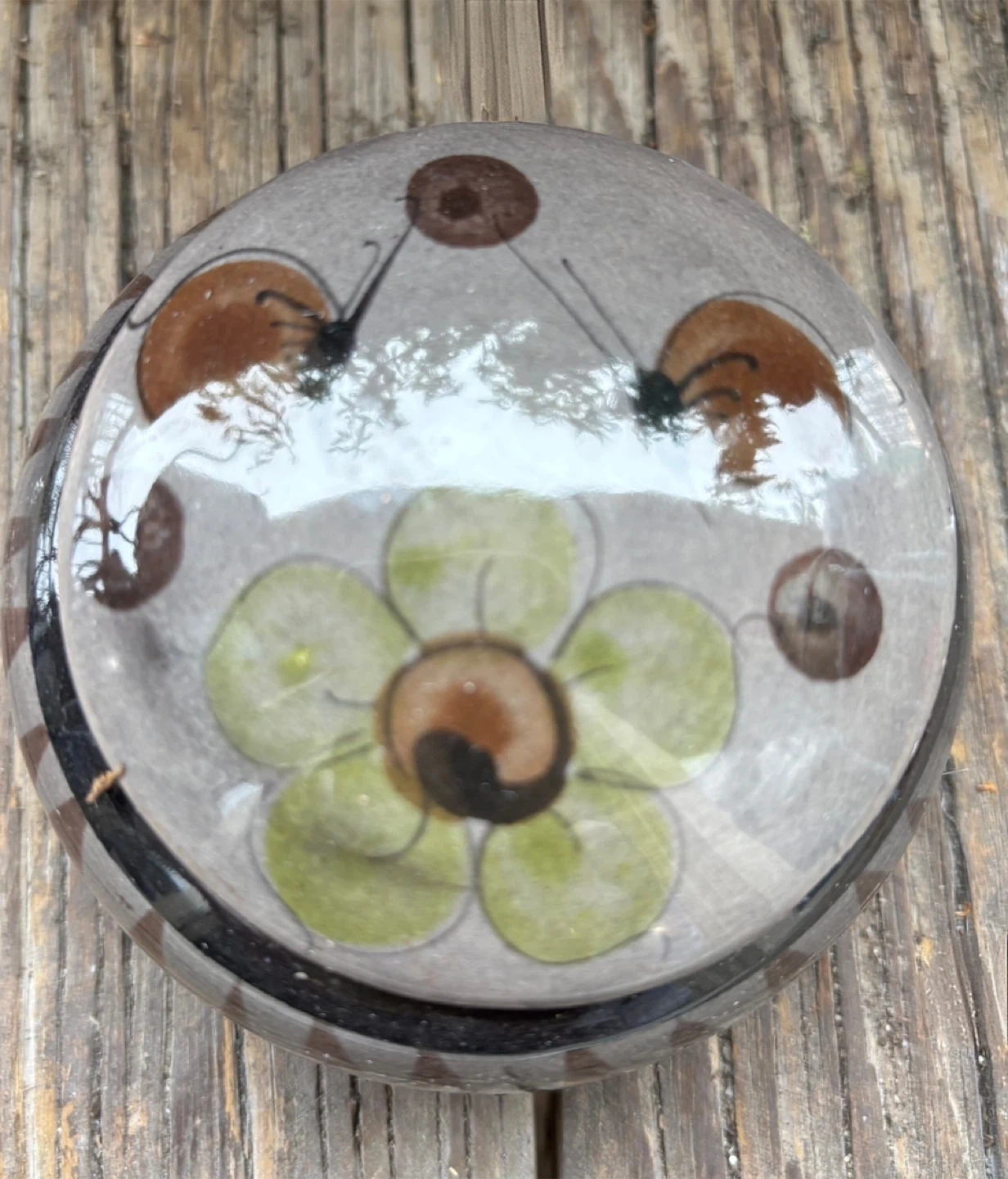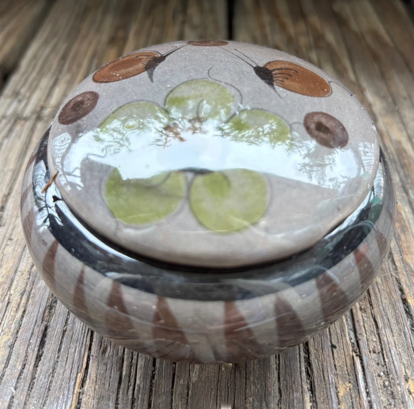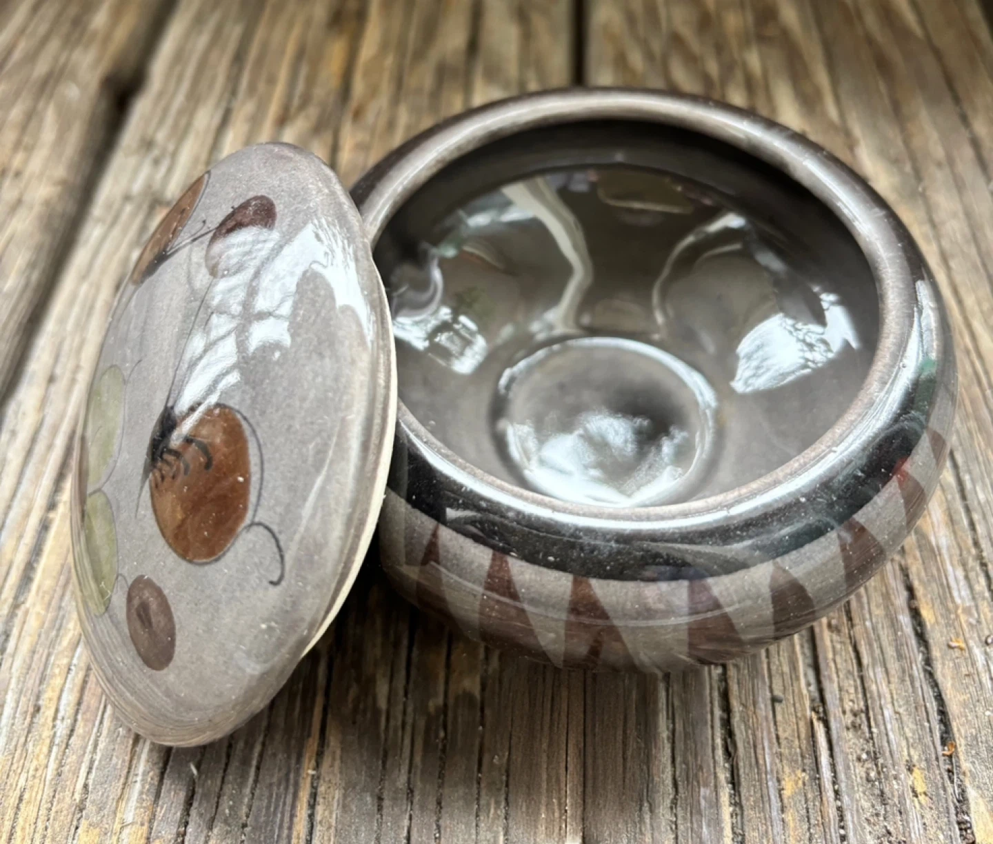 Vintage Painted Ceramic Jar with Lid, Gray with Floral Motif