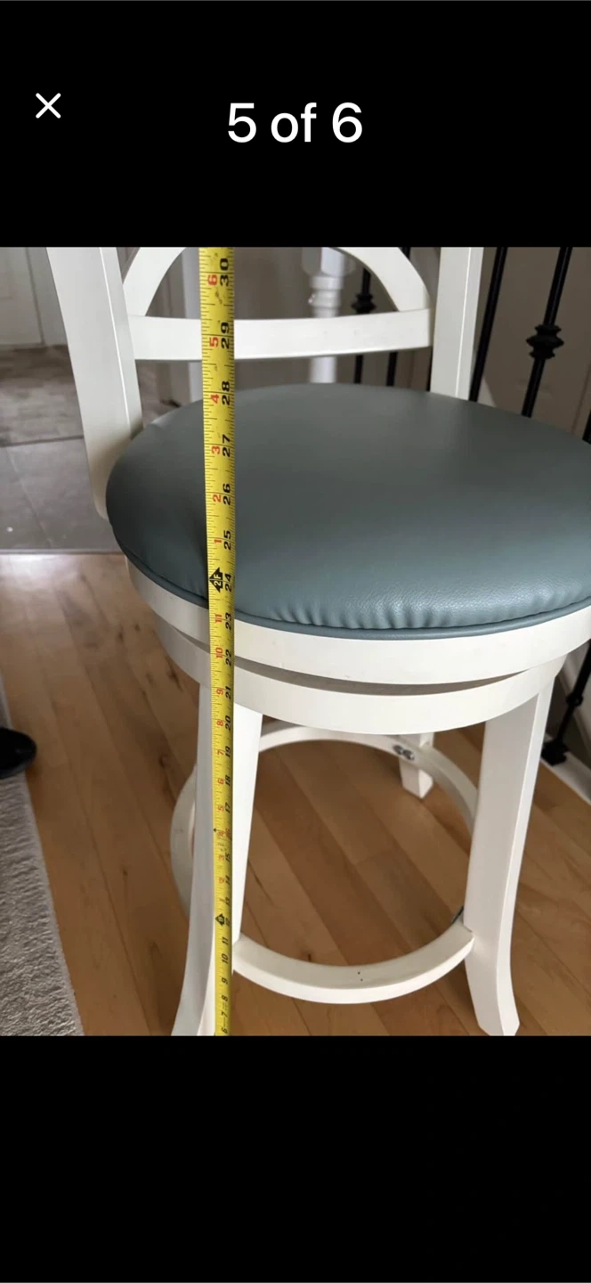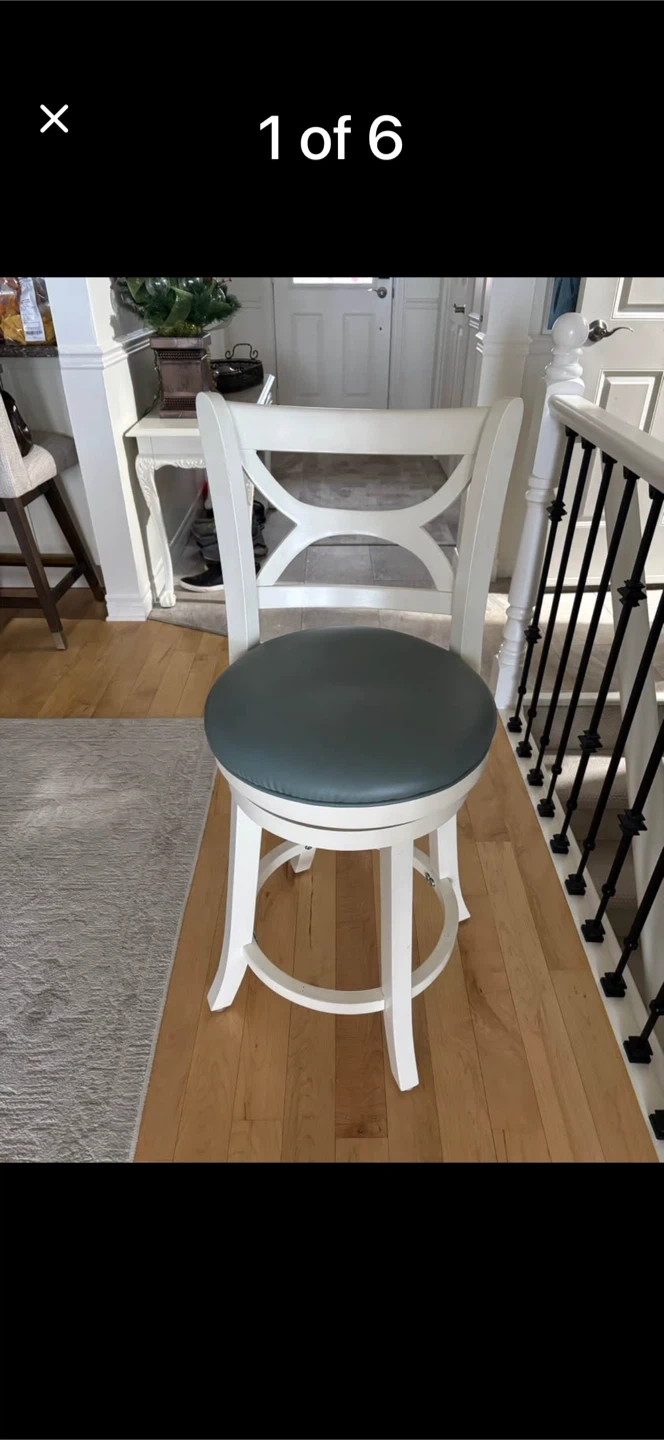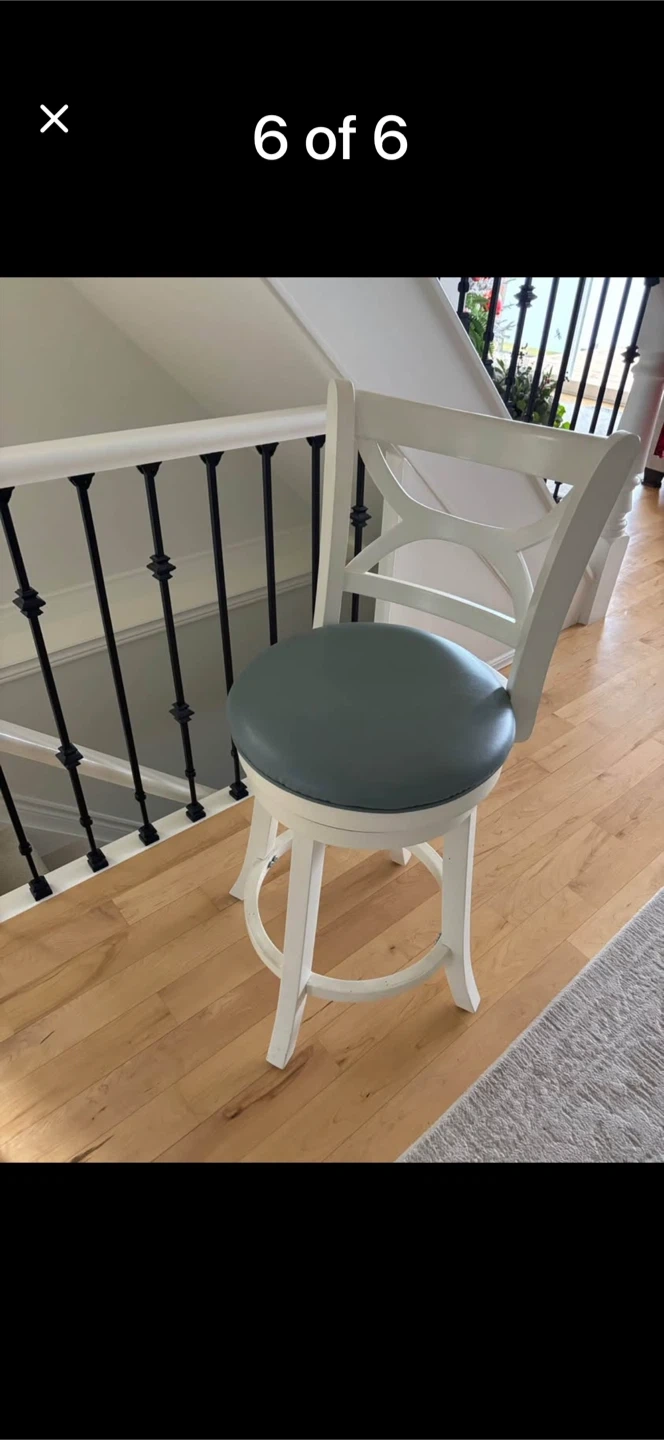 White swivel bar stool with a blue upholstered seat. The stool's back has a decorative crosshatch design. Seat height is approximately 29 inches.