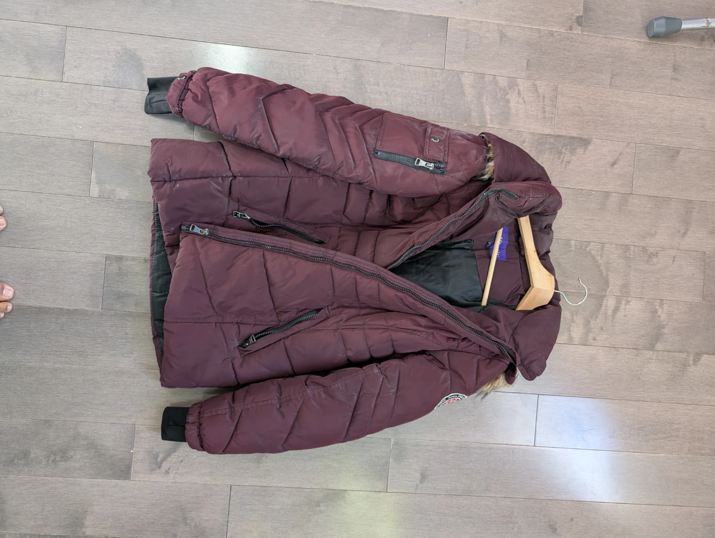 This is a maroon puffer jacket. It has a full zip closure and zippered pockets. The material appears to be a synthetic blend, perfect for cooler weather.
