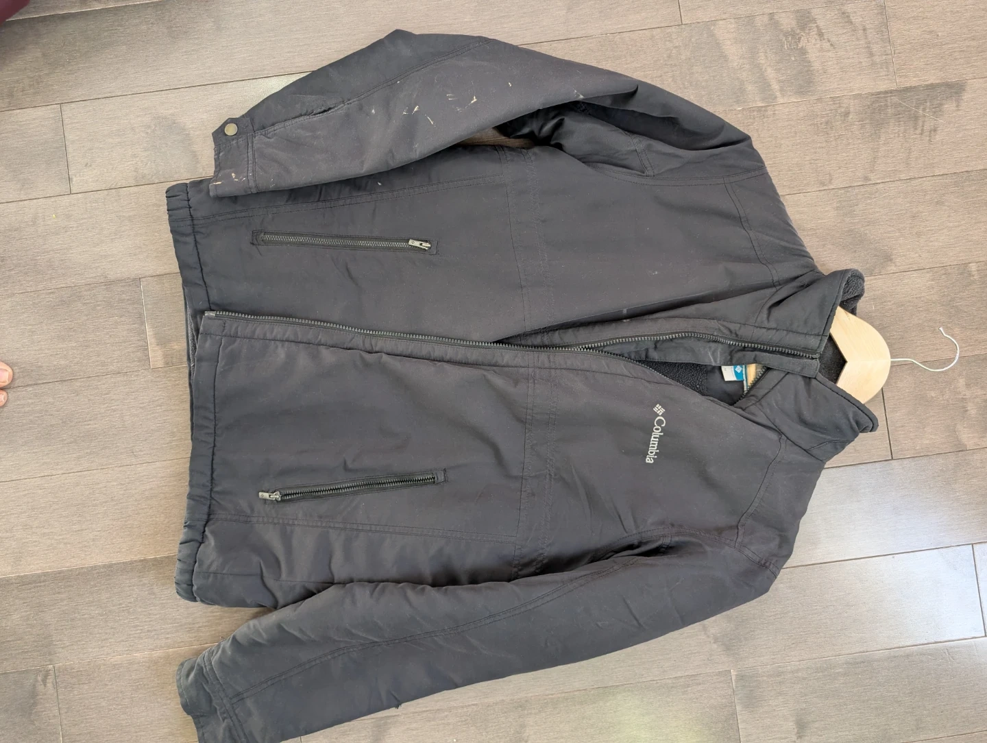 Columbia black jacket with zippered pockets. It's made from a durable material suitable for cooler weather. This jacket is great for outdoor activities.