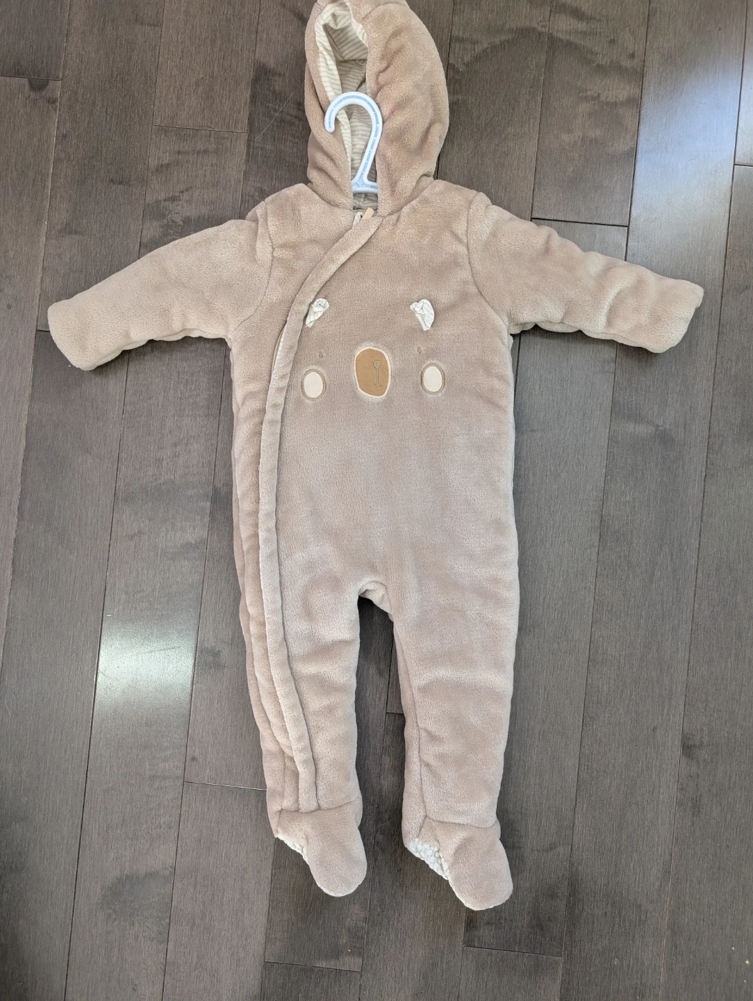 Soft, warm bunting suit for a baby. Features a full-zip closure and a cozy hood. Built-in footies provide extra warmth.