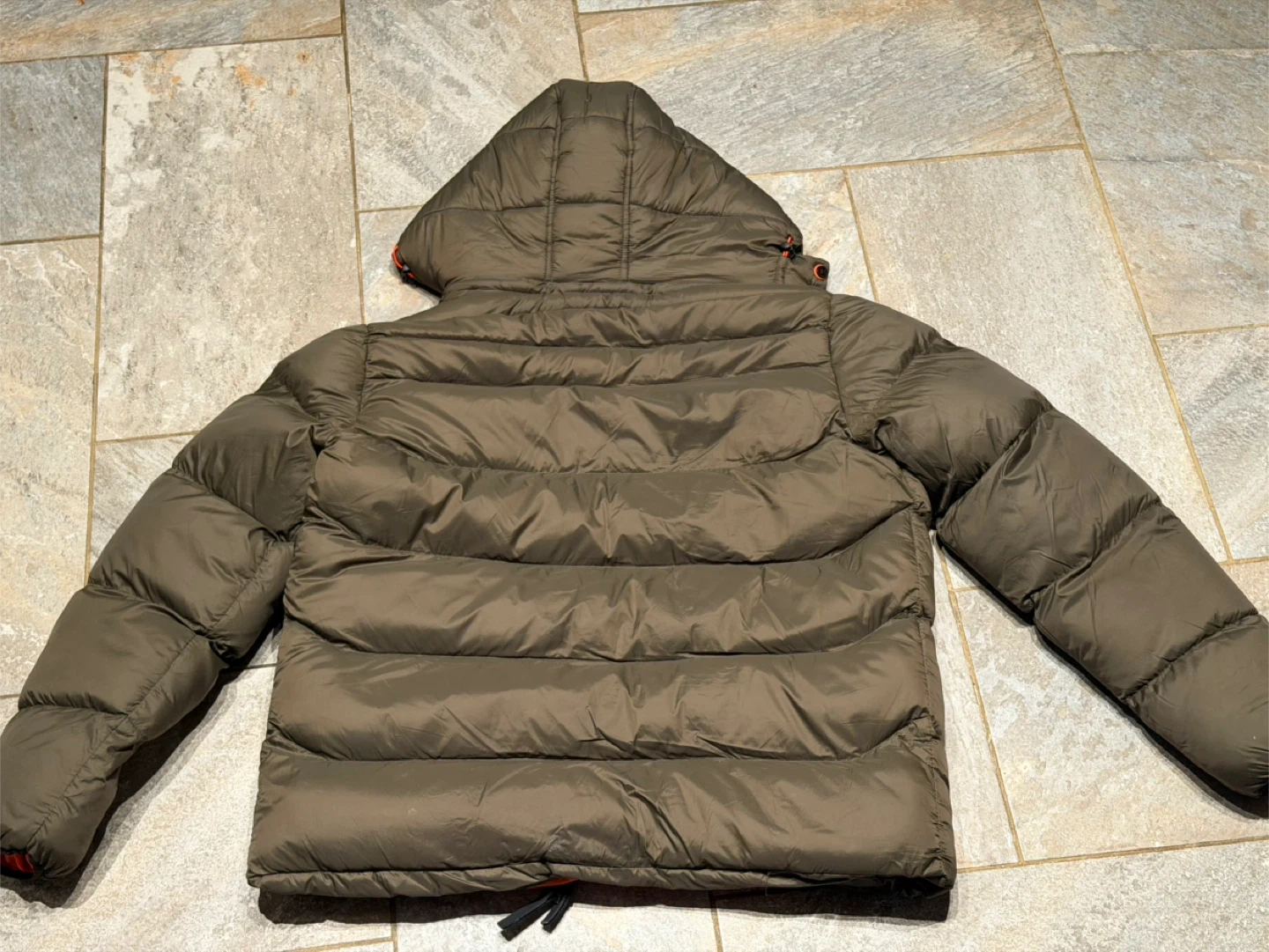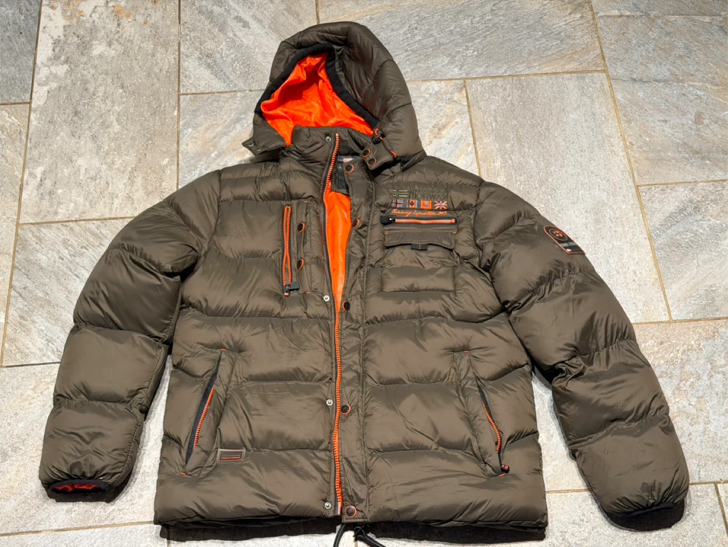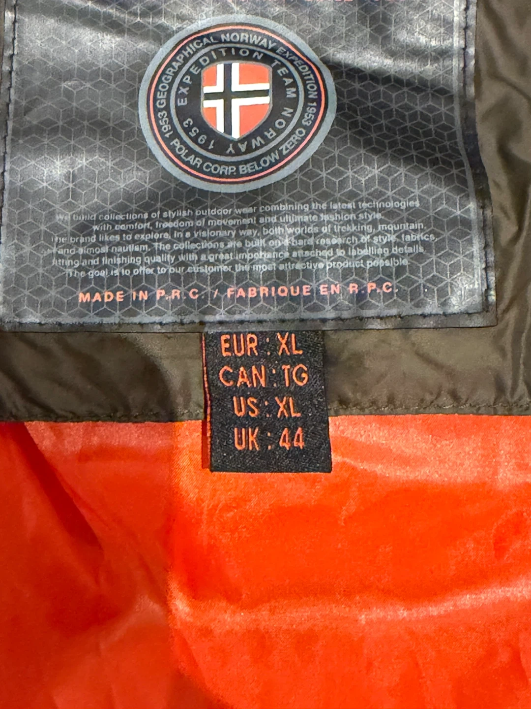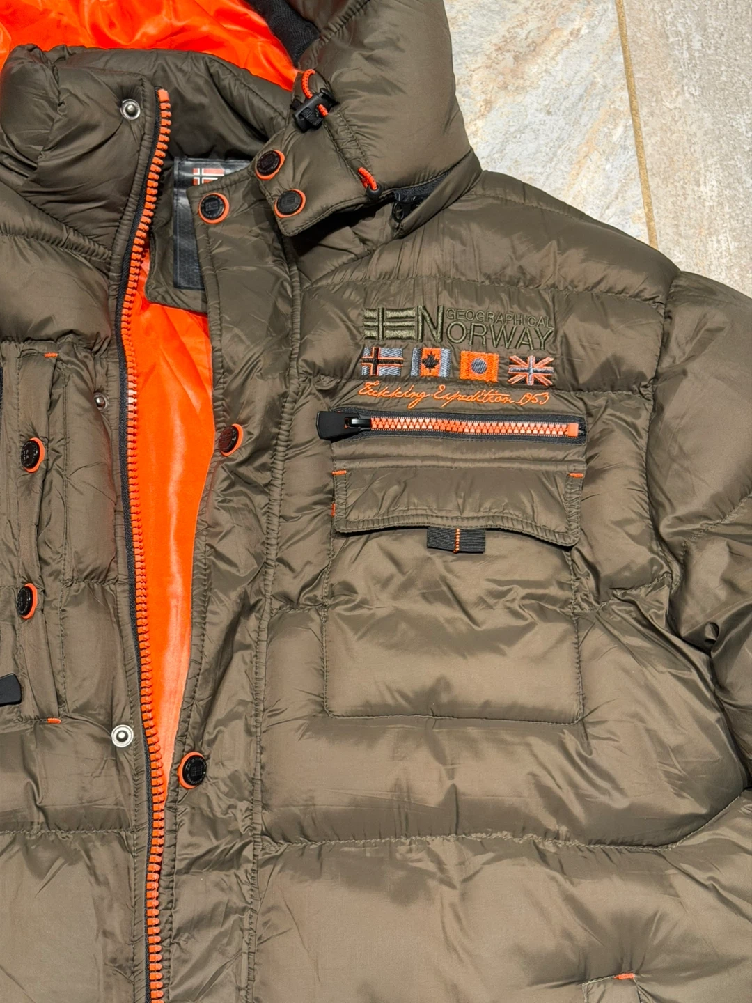 Warm puffer jacket from Geographical Norway. Features a brown exterior and bright orange lining. Size XL (UK 44).