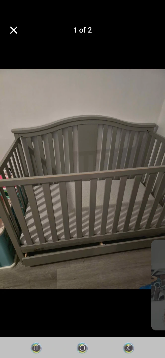 This is a grey baby crib. It's a convertible crib with a drawer for storage. The crib has a modern design with curved headboard. With mattress