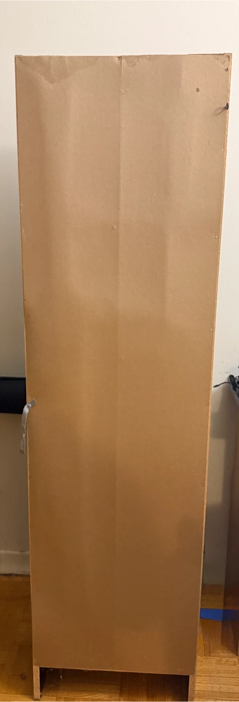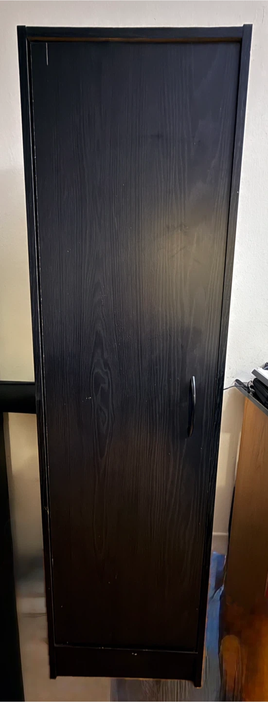 This is a tall, black storage cabinet with a single door. It has multiple shelves for organizing your items. The cabinet is made of wood composite and has a dark wood grain finish. It's suitable for storing books, linens, or general household goods.
