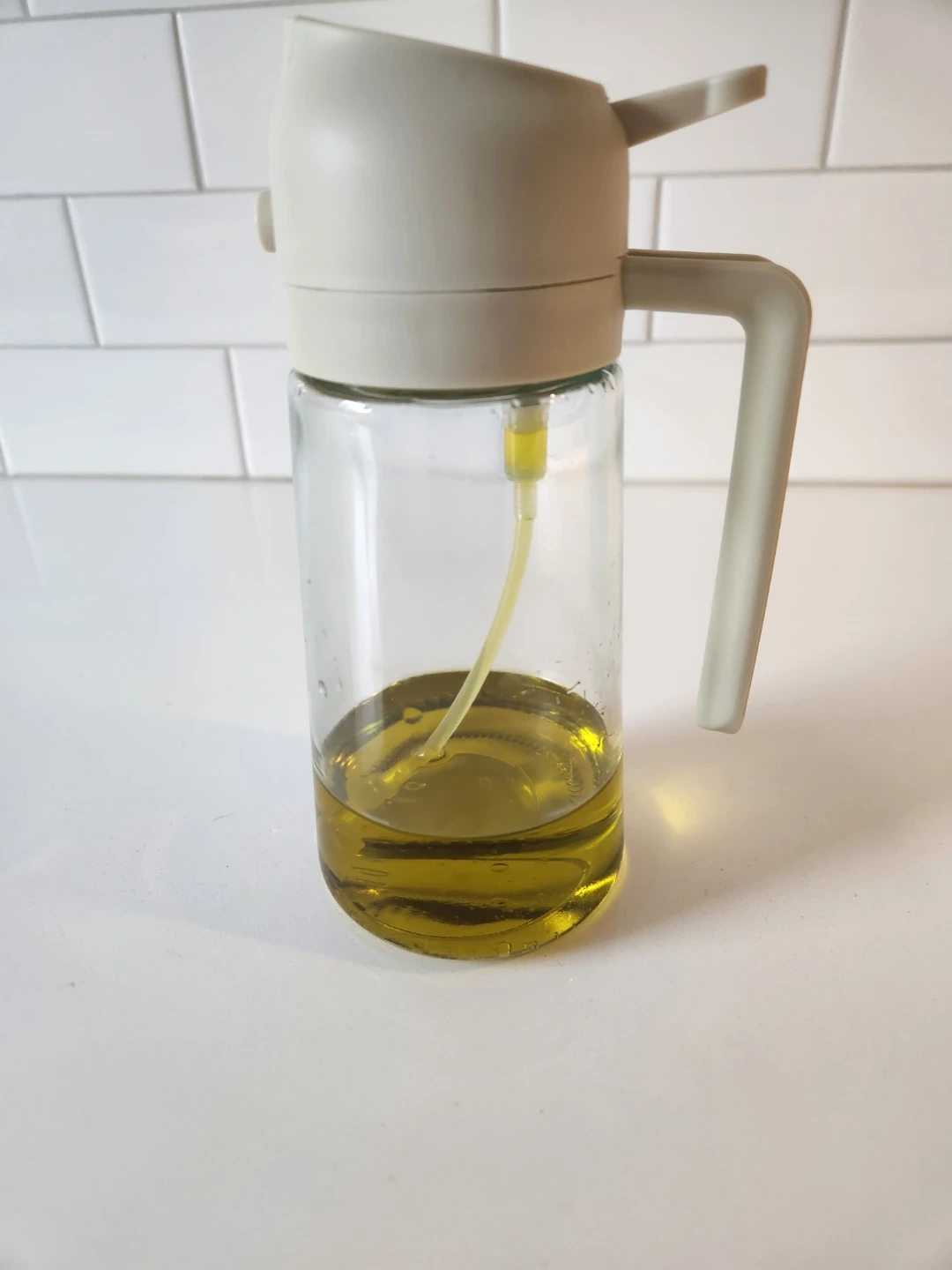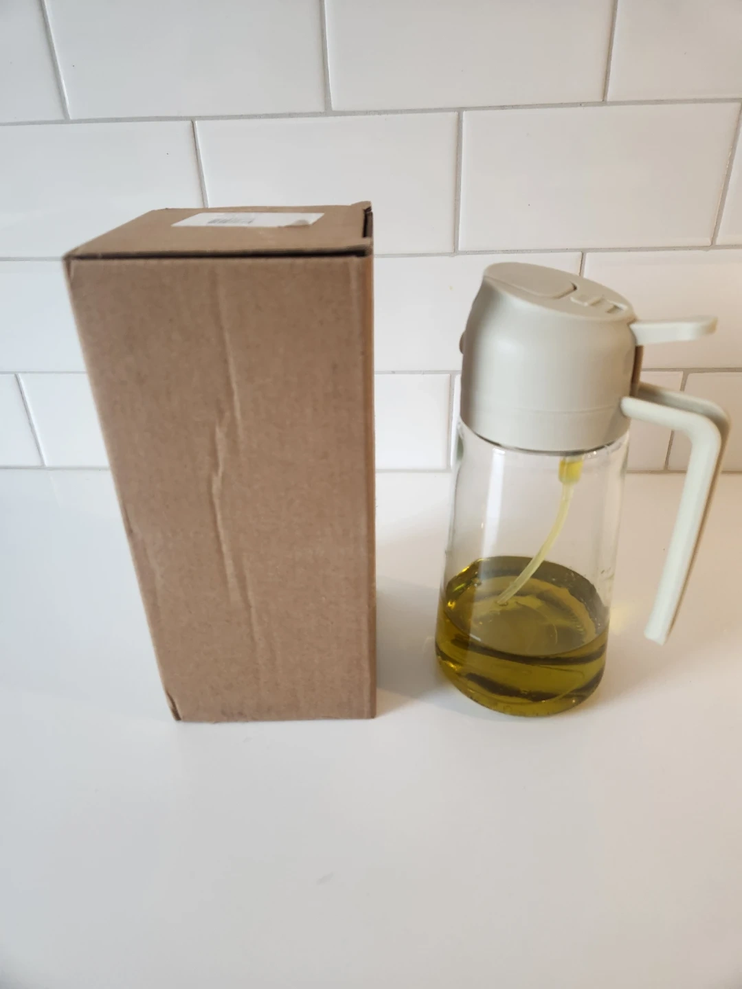 This glass oil sprayer bottle is great for dispensing cooking oil. It's made of glass with a beige plastic lid and handle. Oil not included (this one is mine), have another, brand new in box