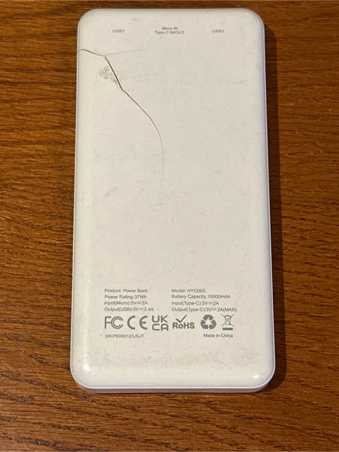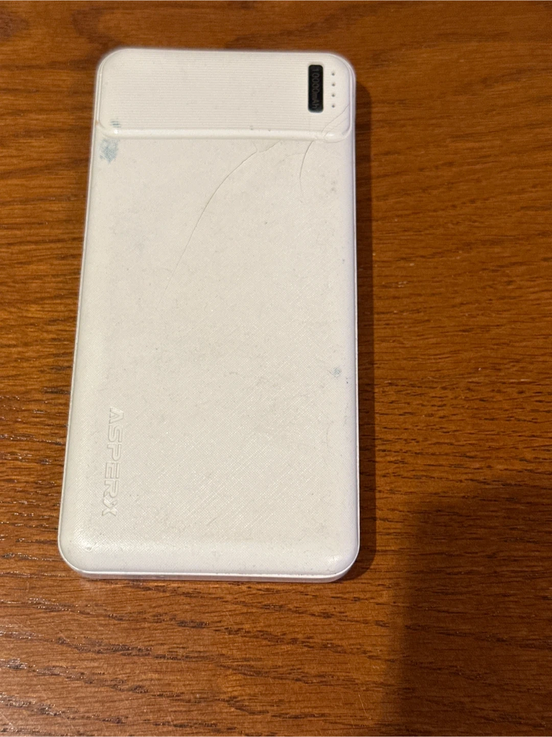 White AsperX power bank with a 10000mAh battery capacity. It has two USB-A ports for output and one Micro USB and one Type-C port for input. The model is HYC003.