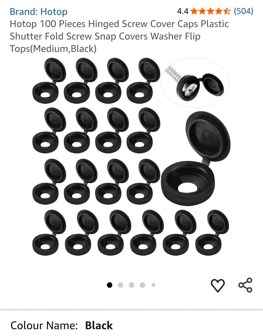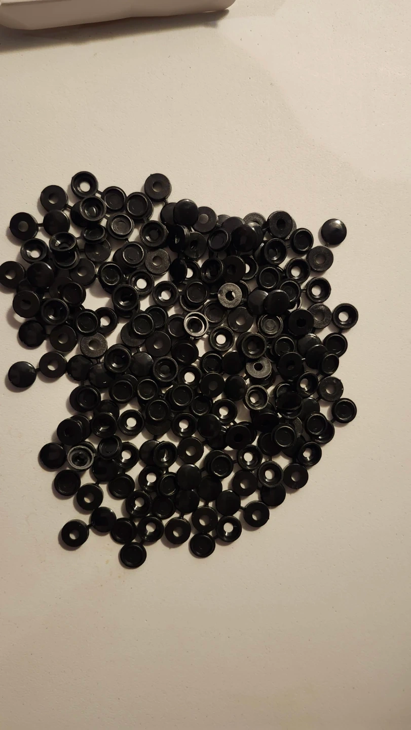 This is a lot of 100 black plastic hinged screw cover caps. They are a medium size. These caps are useful for covering screw heads on furniture or other projects.