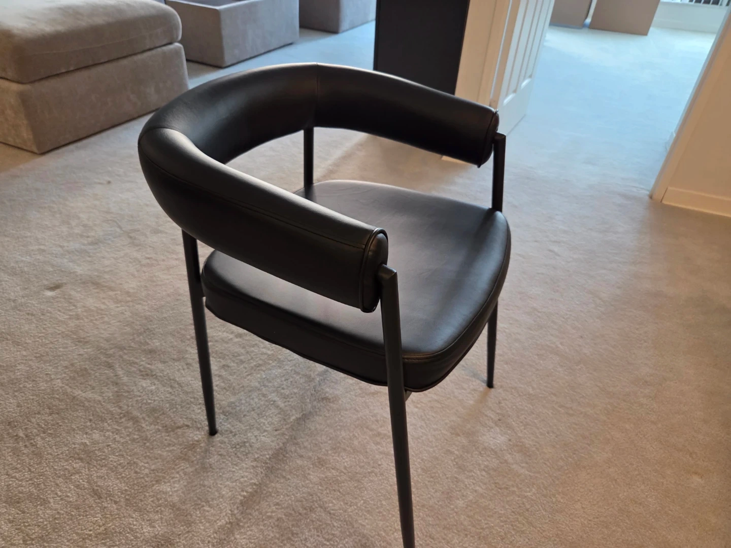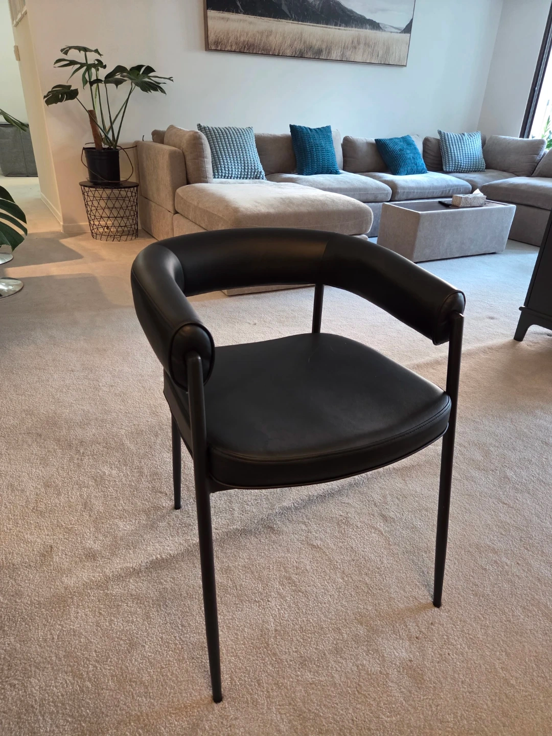 Set of six modern dining chairs. Upholstered in black faux leather with slim black metal legs. Ergonomic curved backrests provide comfortable seating. These chairs would be great for a contemporary dining room or kitchen space.