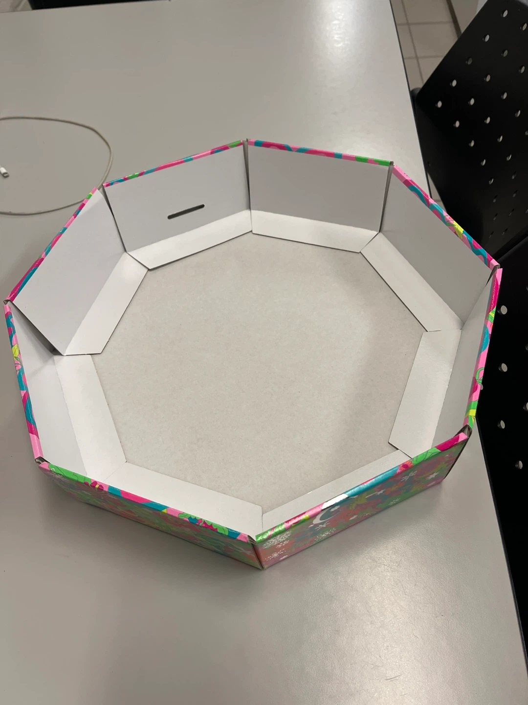 This octagonal box features a vibrant, colourful design. It's ideal for storing small items or as a unique gift presentation. The sturdy cardboard construction ensures it'll hold its shape.