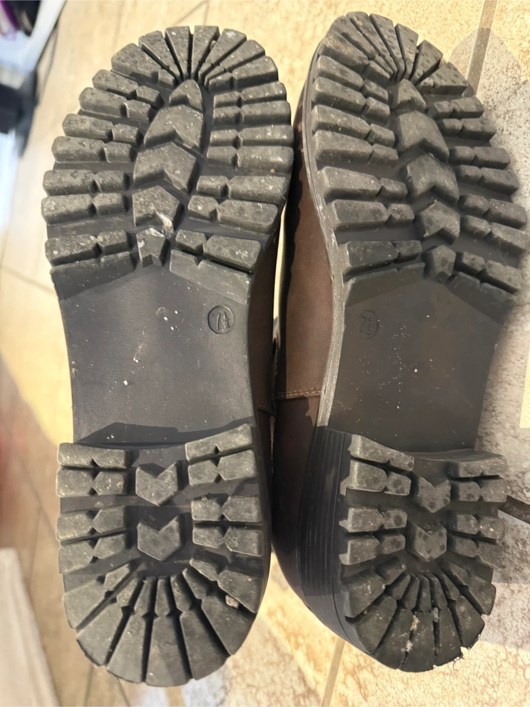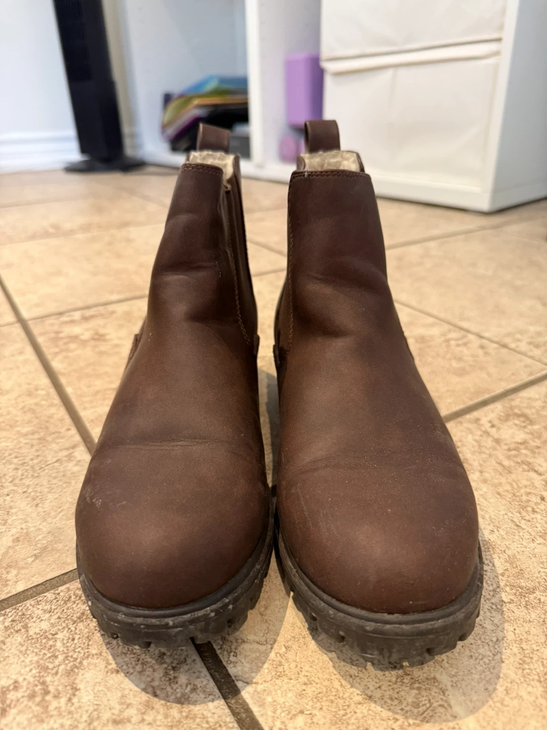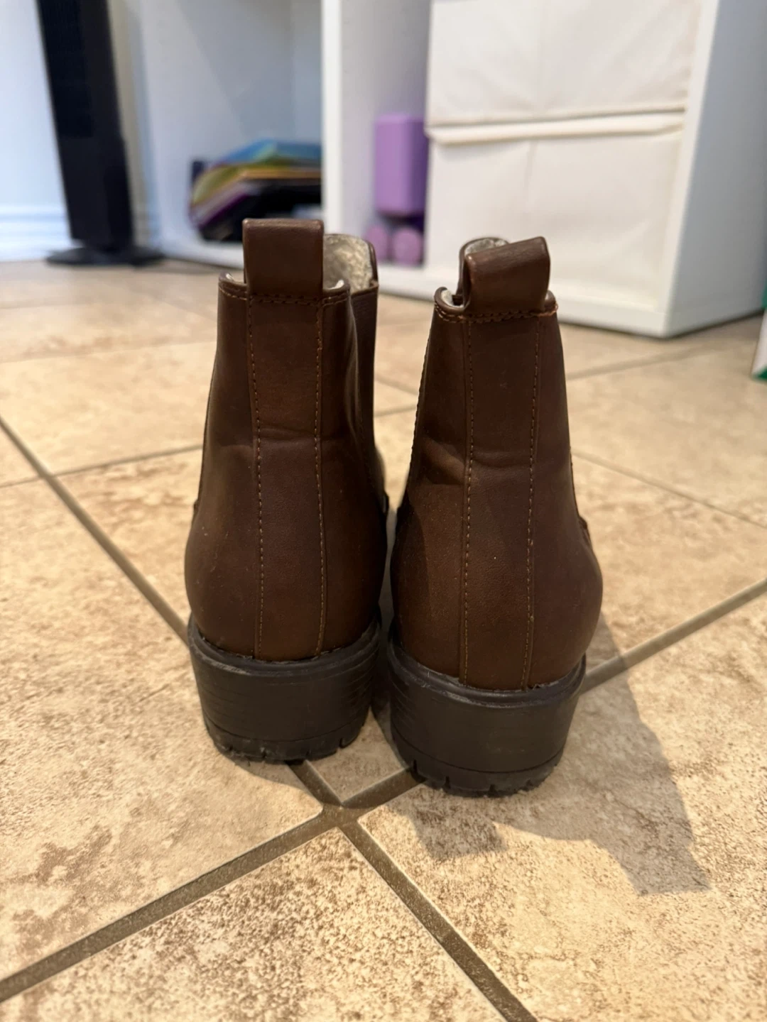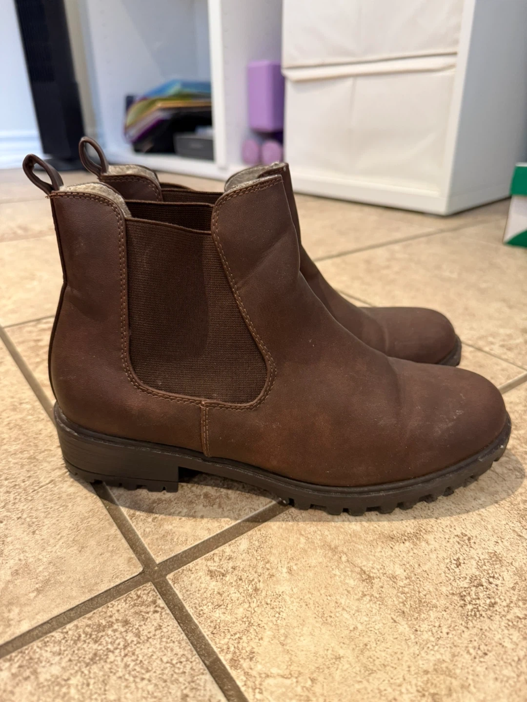 These brown Chelsea boots feature a faux-leather upper with elastic side panels for easy on and off. They have a durable rubber sole with good tread. The lining appears to be a soft, warm material. These boots are suitable for everyday wear and keeping your feet dry and cozy.