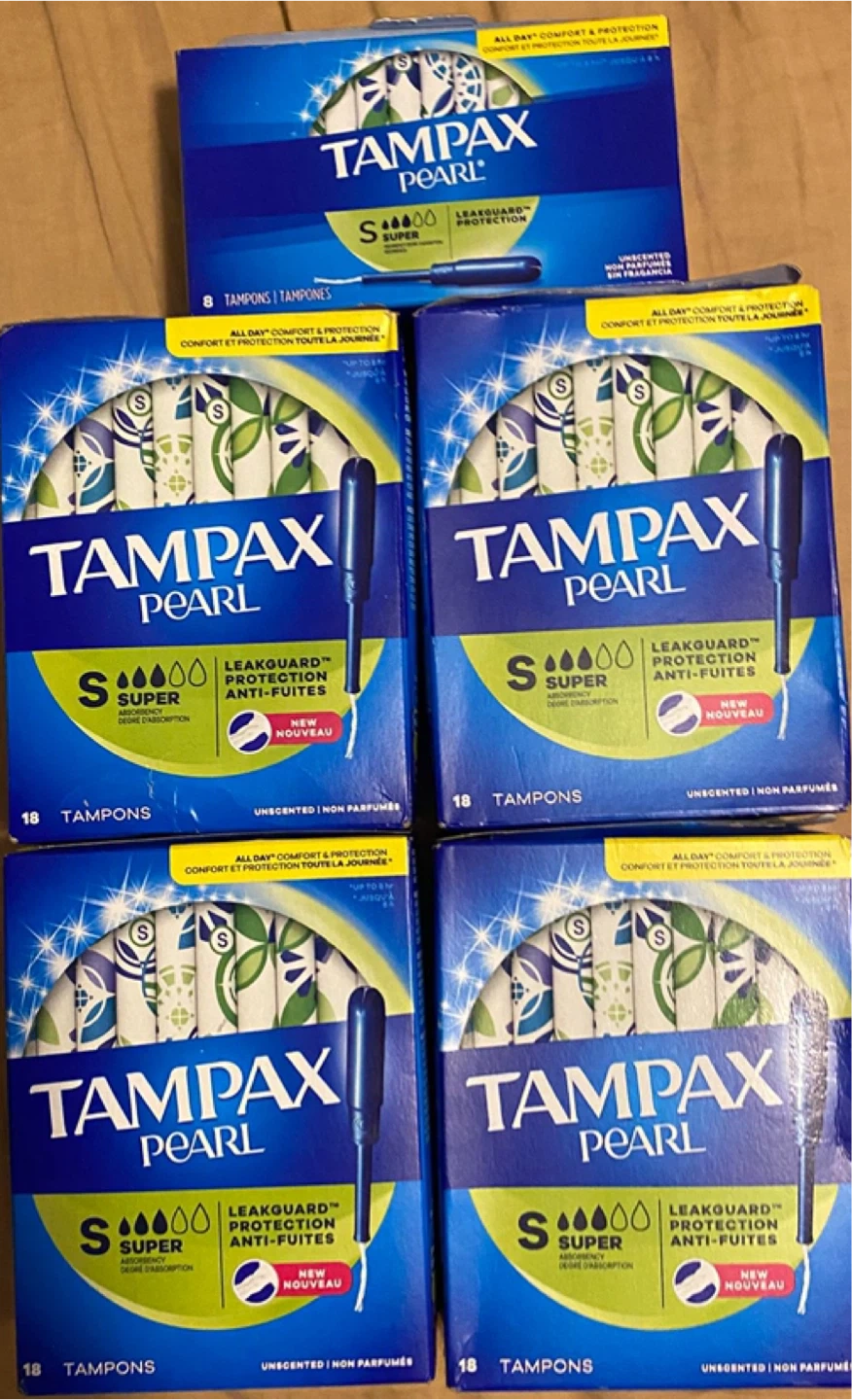 Four boxes of Tampax Pearl tampons. Each box contains 18 Super absorbency tampons. They are unscented for all-day comfort and protection. LeakGuard protection helps prevent leaks.