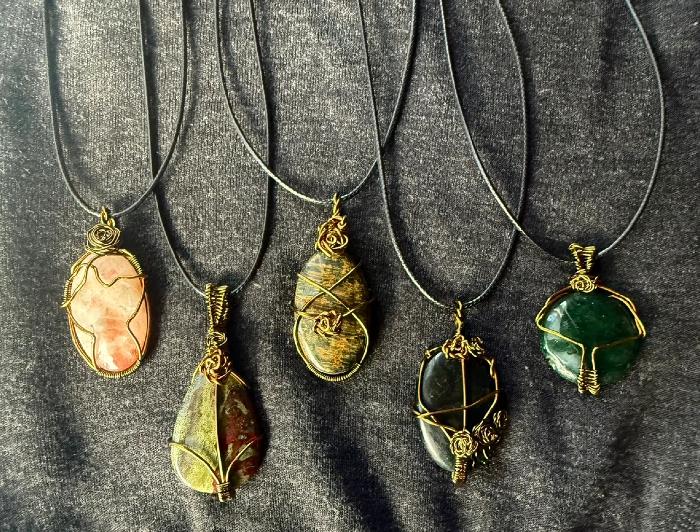 Selling a set of five handmade unique wire-wrapped gemstone pendants. Each stone is beautifully encased in brass-tone wire and hangs on a black cord necklace. These pendants offer a touch of natural beauty and artisan craftsmanship.