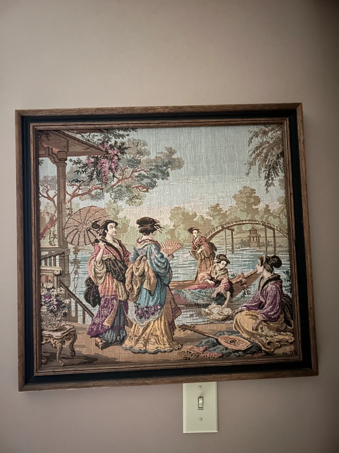 This framed tapestry depicts a serene scene with several geishas in traditional attire. The artwork showcases intricate details and vibrant colours. It's a beautiful piece for adding a touch of elegance to your home decor. The tapestry is framed in a classic wooden frame.