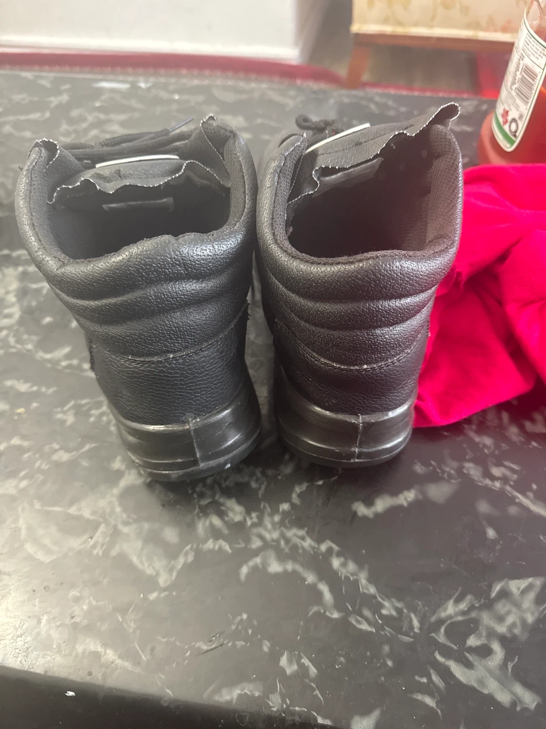 Black work boots with oil and slip resistance. They feature a shock absorber sole and a reinforced toe. Size 11 is clearly marked on the soles.
