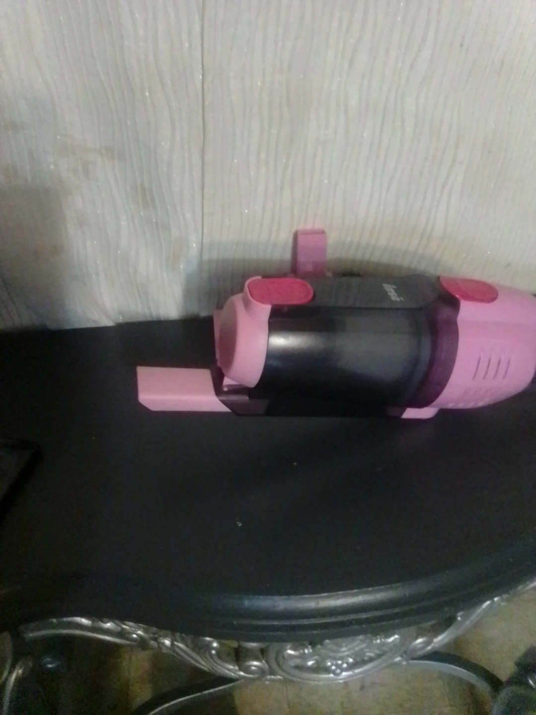 This is a pink handheld vacuum cleaner. It's lightweight and easy to maneuver. The vacuum comes with a cord for power.very quiet 🤫.