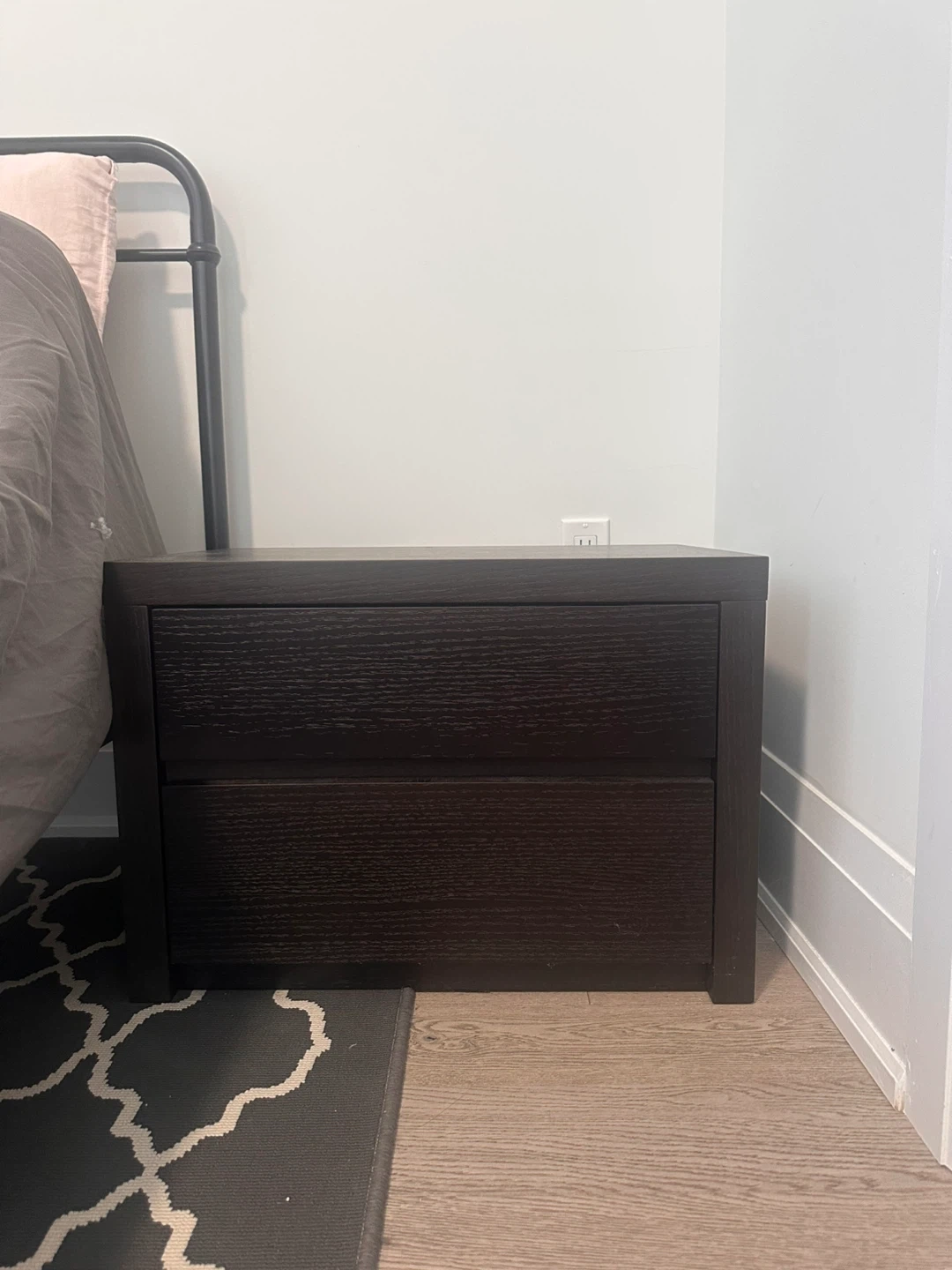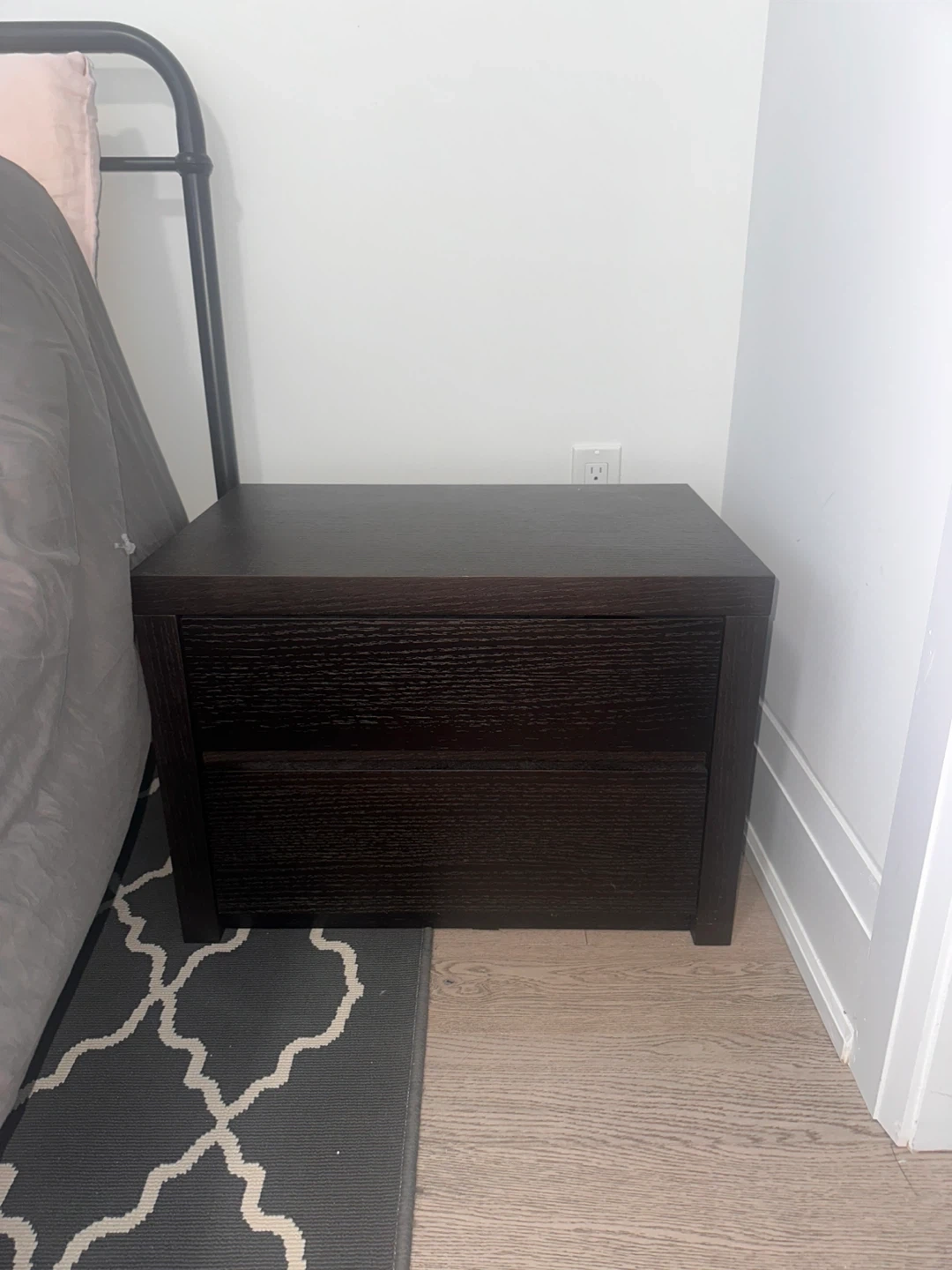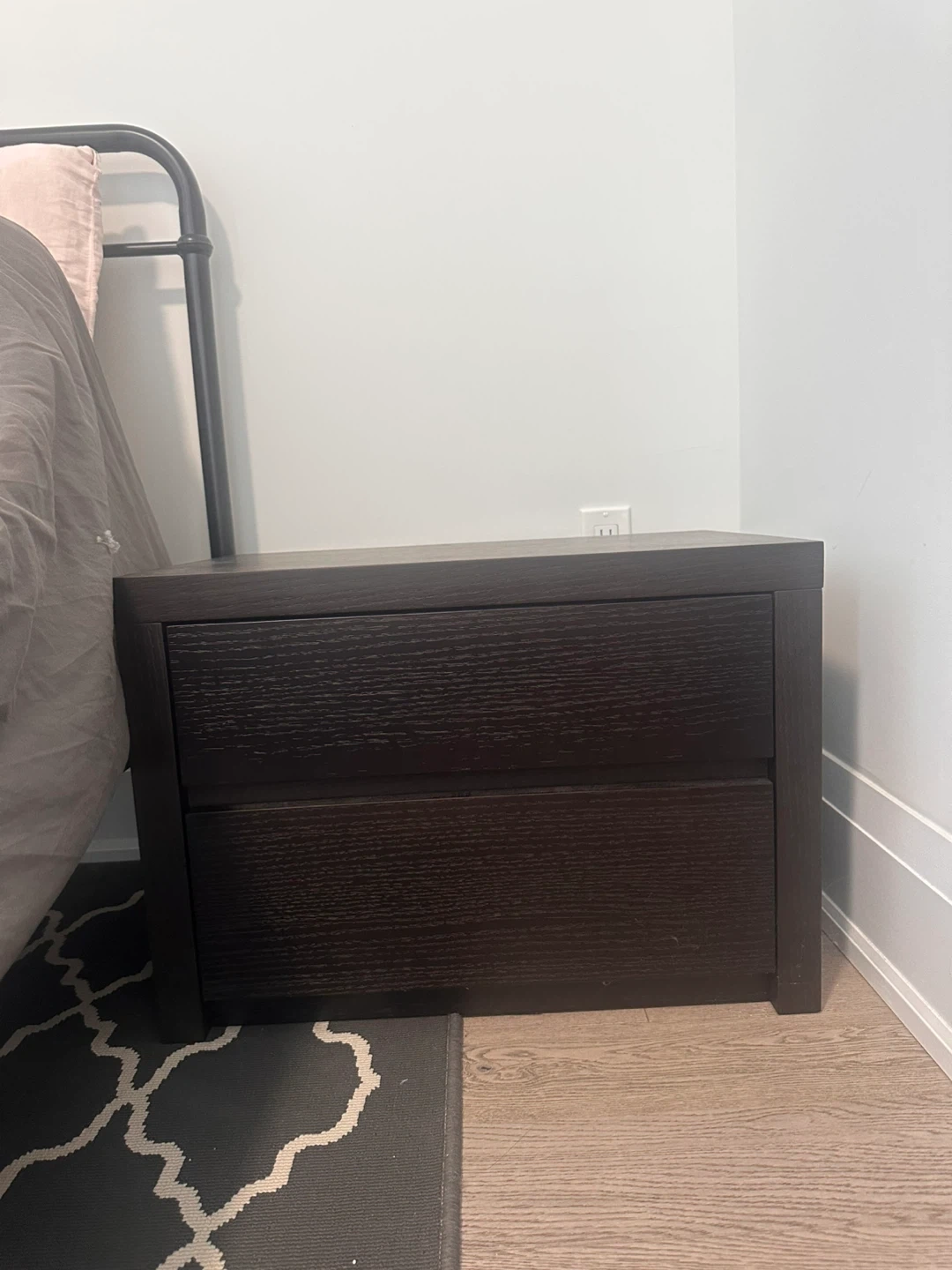 A simple dark brown nightstand with two drawers. It's made of wood and offers convenient bedside storage. Perfect for keeping your room tidy!