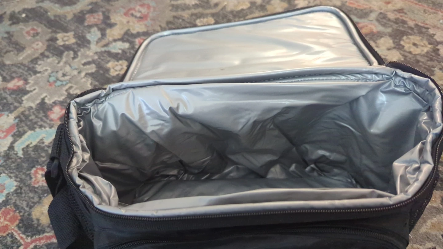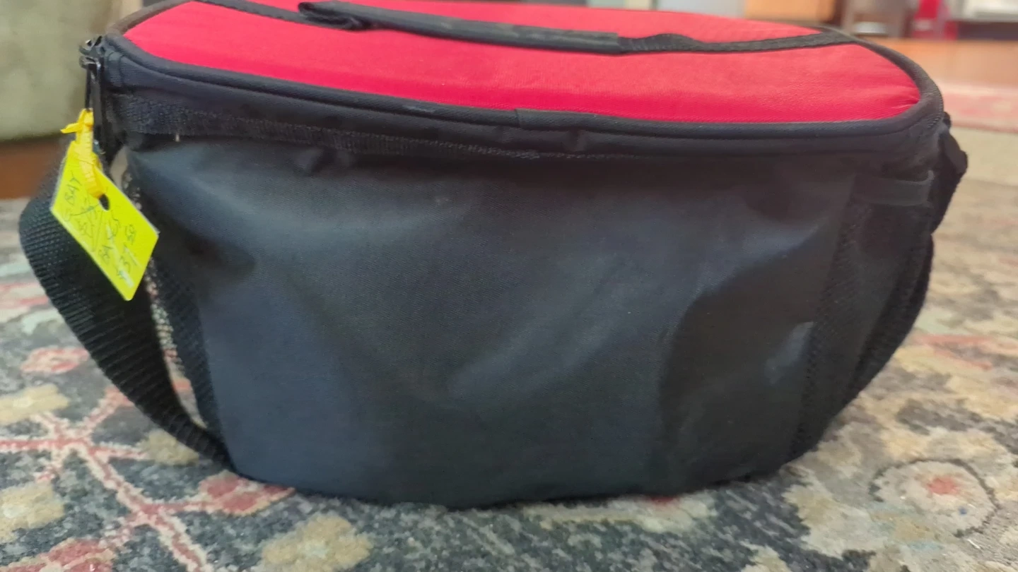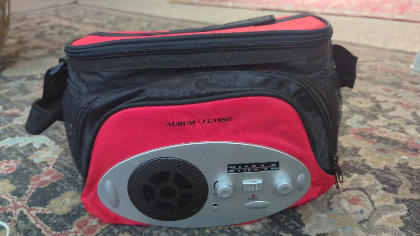 This is a black and red insulated cooler bag with a built-in AM/FM radio. It's great for picnics and outdoor events. Insulated lining keeps contents cool.