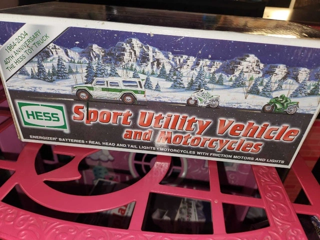 Selling a used Hess 2004 Sport Utility Vehicle and Motorcycles set. This collectible includes an SUV and two motorcycles, with working lights. It has been well-maintained and comes in the original box. A great addition to any Hess toy collection or a fun gift!
