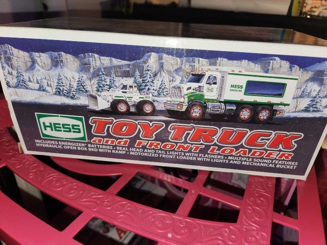 Get ready to rev up some fun with the Hess Toy Truck and Front Loader from 2008! This collectible is in new condition, ready to light up any collection with its real headlights, taillights, and multiple sound features. It also includes Energizer batteries! Here are some cool features: Real Head and Tail Lights with Flashers, Multiple Sound Features, Hydraulic Open Box Bed with Ramp, Motorized Front Loader with Lights and Mechanical Bucket. NEW in original box, never played with. Cash accepted.