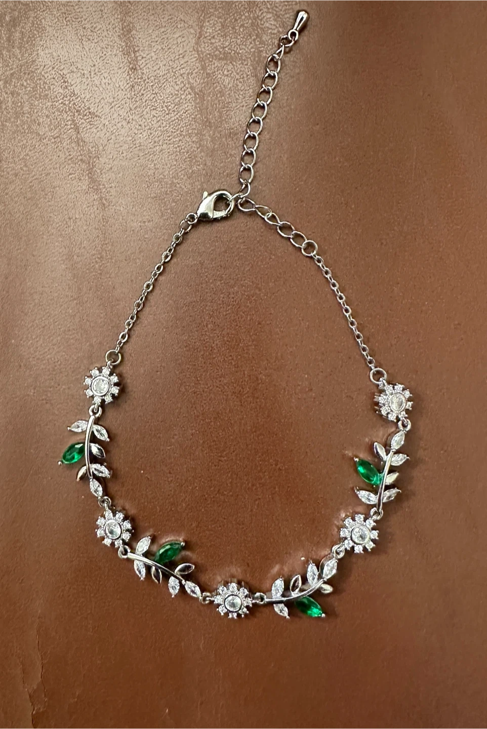 This pretty silver-tone bracelet features a delicate leaf and flower design. It has small green gems interspersed with sparkling clear stones. It's adjustable for a comfortable fit!