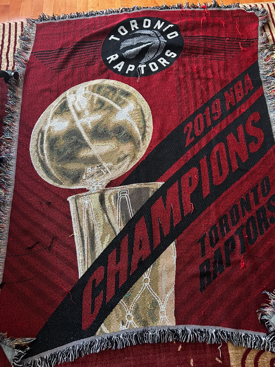 Celebrate the 2019 NBA Champions with this Toronto Raptors woven blanket! It features a vibrant design showcasing the Larry O'Brien Championship Trophy and the team's victory. Perfect for any Raptors fan!