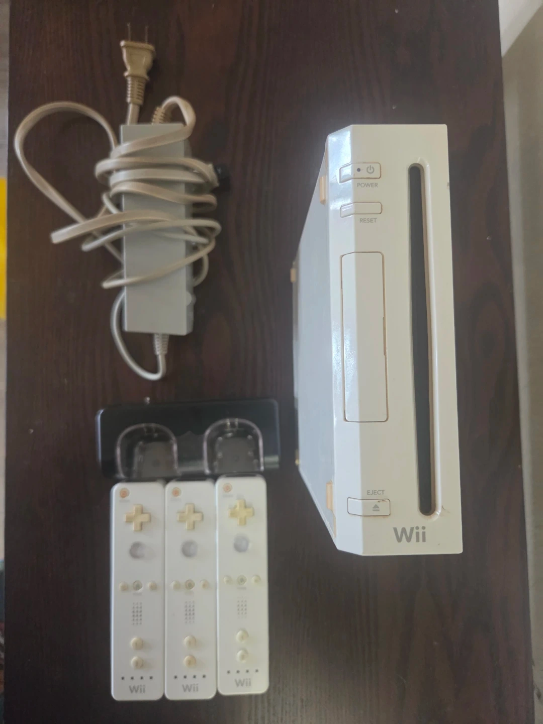 This is a white Nintendo Wii console. It comes with three Wii controllers and a charging dock for the controllers. An AC adapter is also included. It's ready for some family fun!