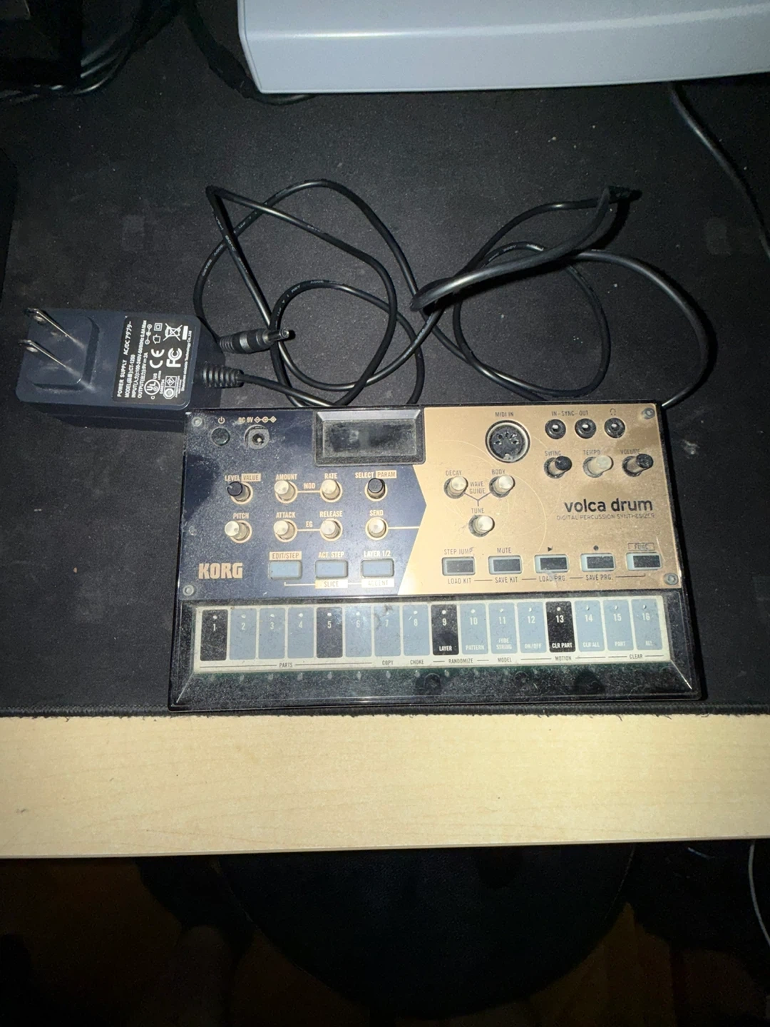 This is a Korg Volca Drum digital percussion synthesizer. It's a compact unit for creating drum patterns and rhythms. Includes power adapter. Honestly down to trade for another analog drum machine or maybe a synth as well. Hit me if you’re interested!