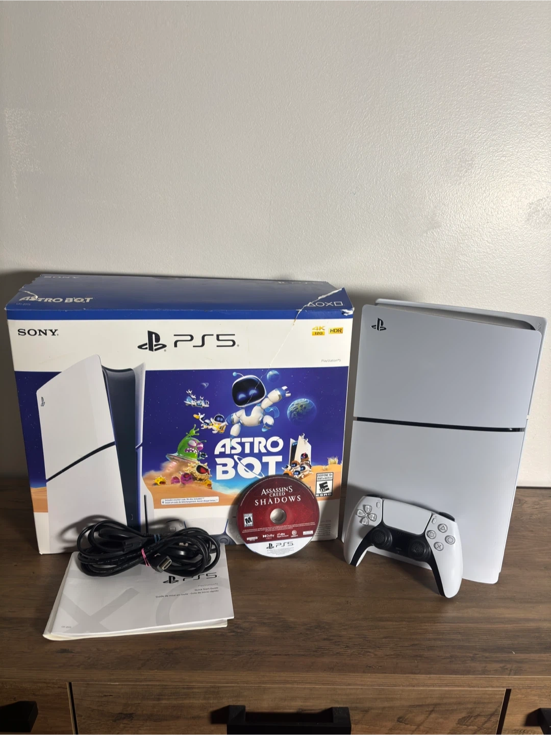 Clean, powerful, and fully complete — this PS5 Slim Disc 1TB Astro Bot Edition comes ready to play with all original packaging and an additional game.