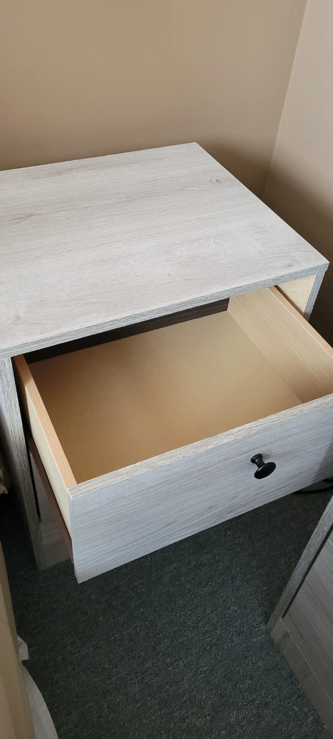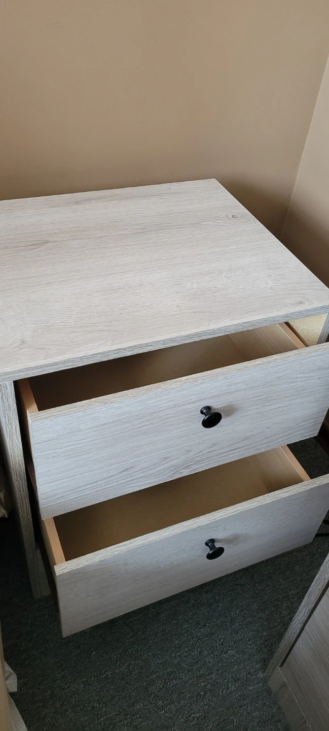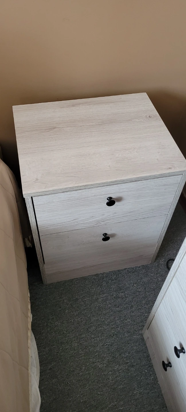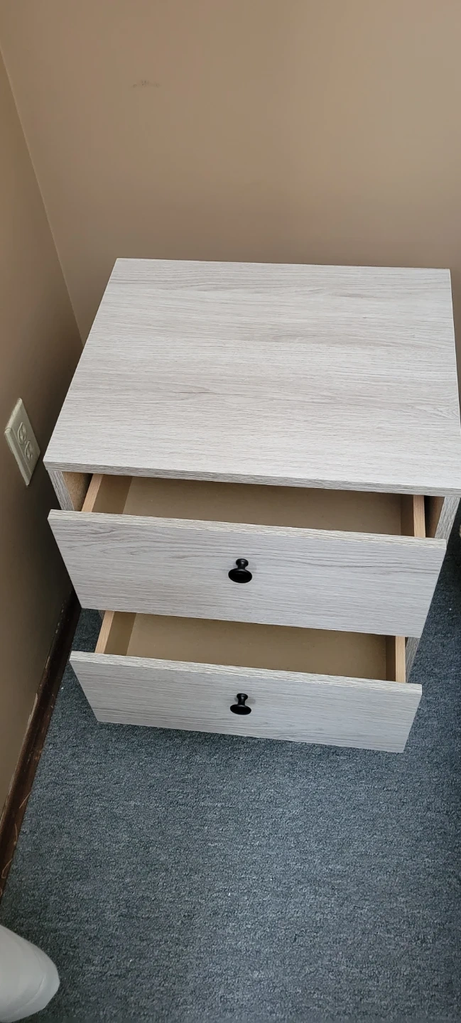 This 2-drawer nightstand features a light wood grain finish and black hardware. It's perfect for storing bedside essentials. A matching 5-drawer dresser is also available, all in the same color/ look barely used