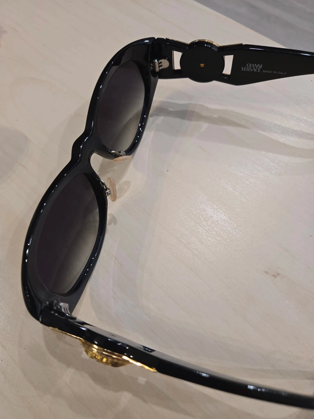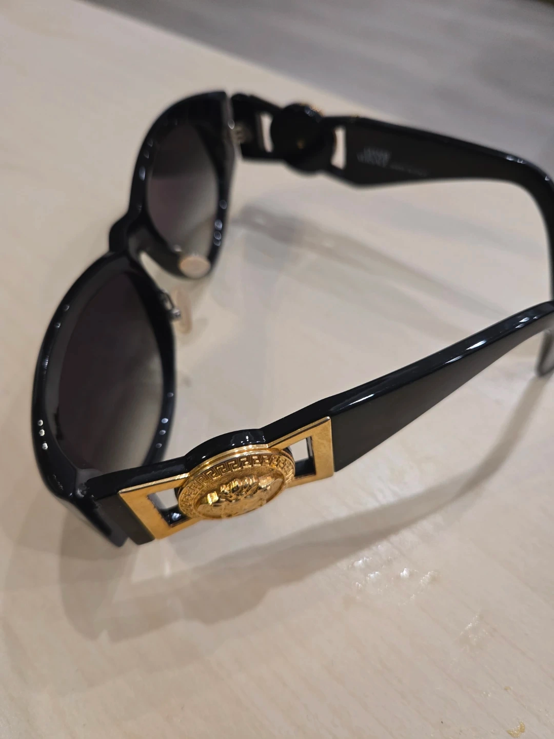 These black Versace sunglasses feature a bold, stylish design with the iconic Medusa head accent. Made in Italy, they're crafted for a chic look. Perfect for completing any outfit on a sunny day!