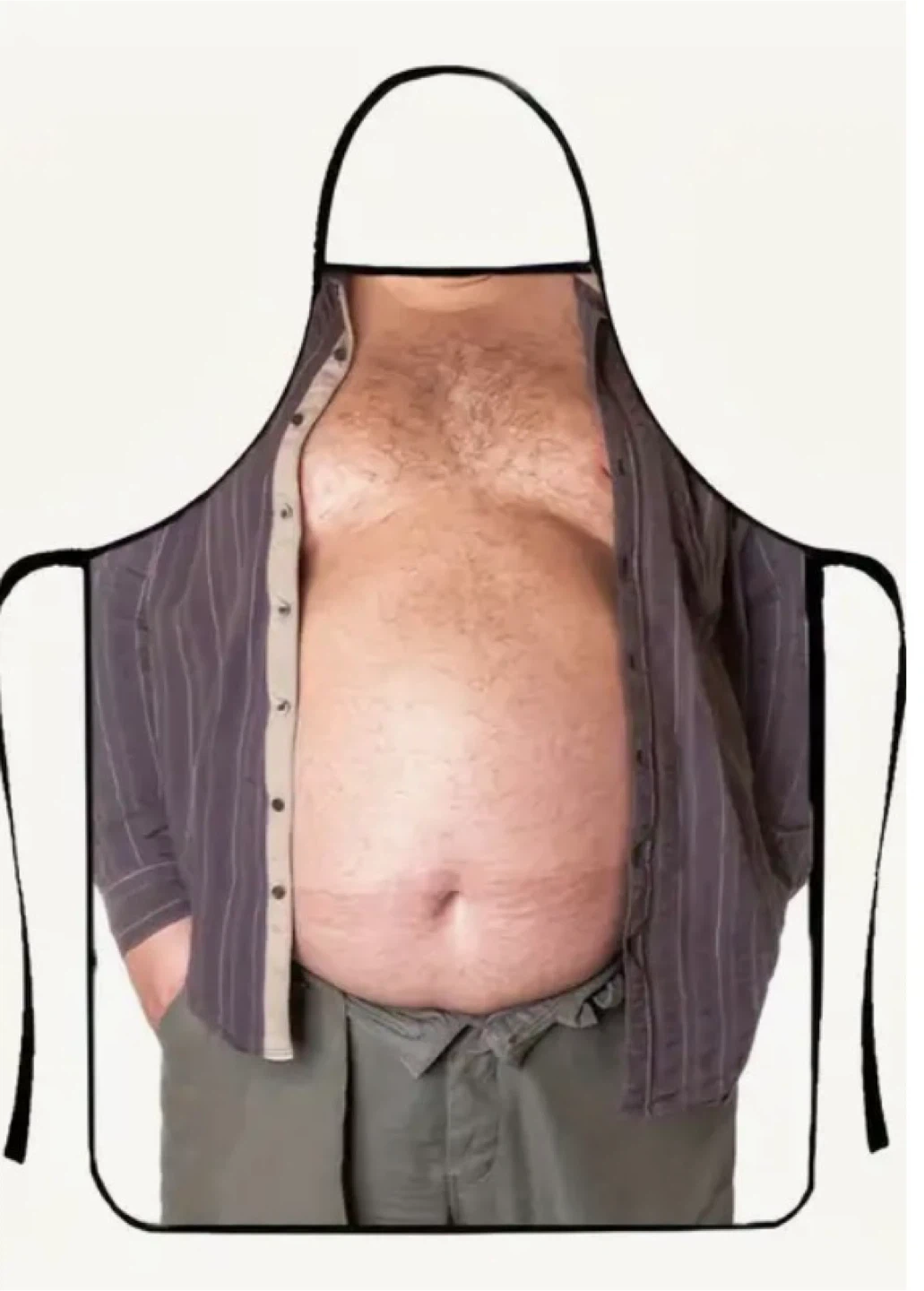 This apron features a realistic print of a man's torso with a button-down shirt. It's made of a polyester blend and includes adjustable neck and waist ties. Great for laughs at your next barbecue!