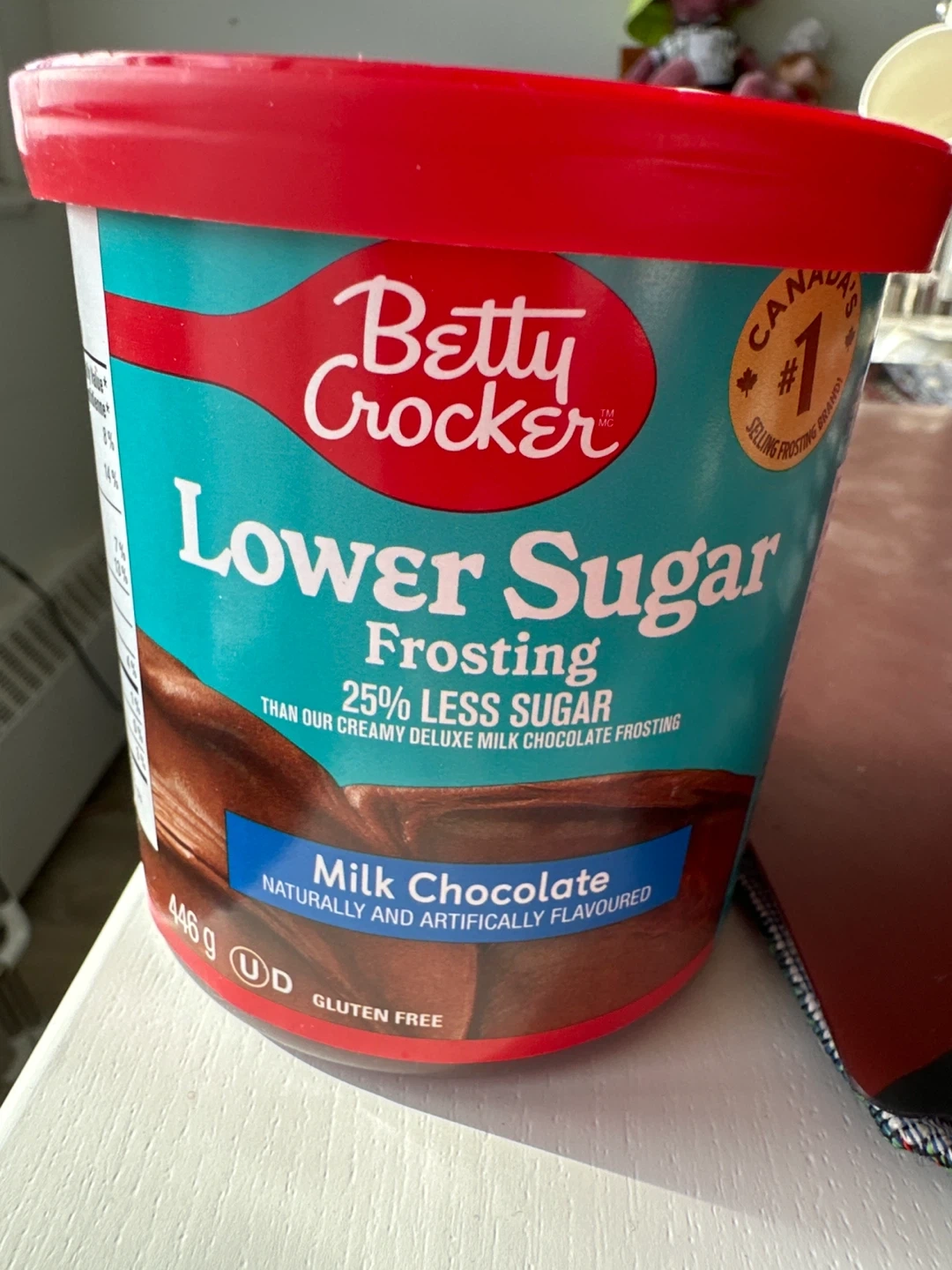 Betty Crocker Lower Sugar Milk Chocolate Frosting. It's 25% less sugar than their creamy deluxe milk chocolate frosting. This frosting is gluten-free and naturally and artificially flavoured. 446g container.