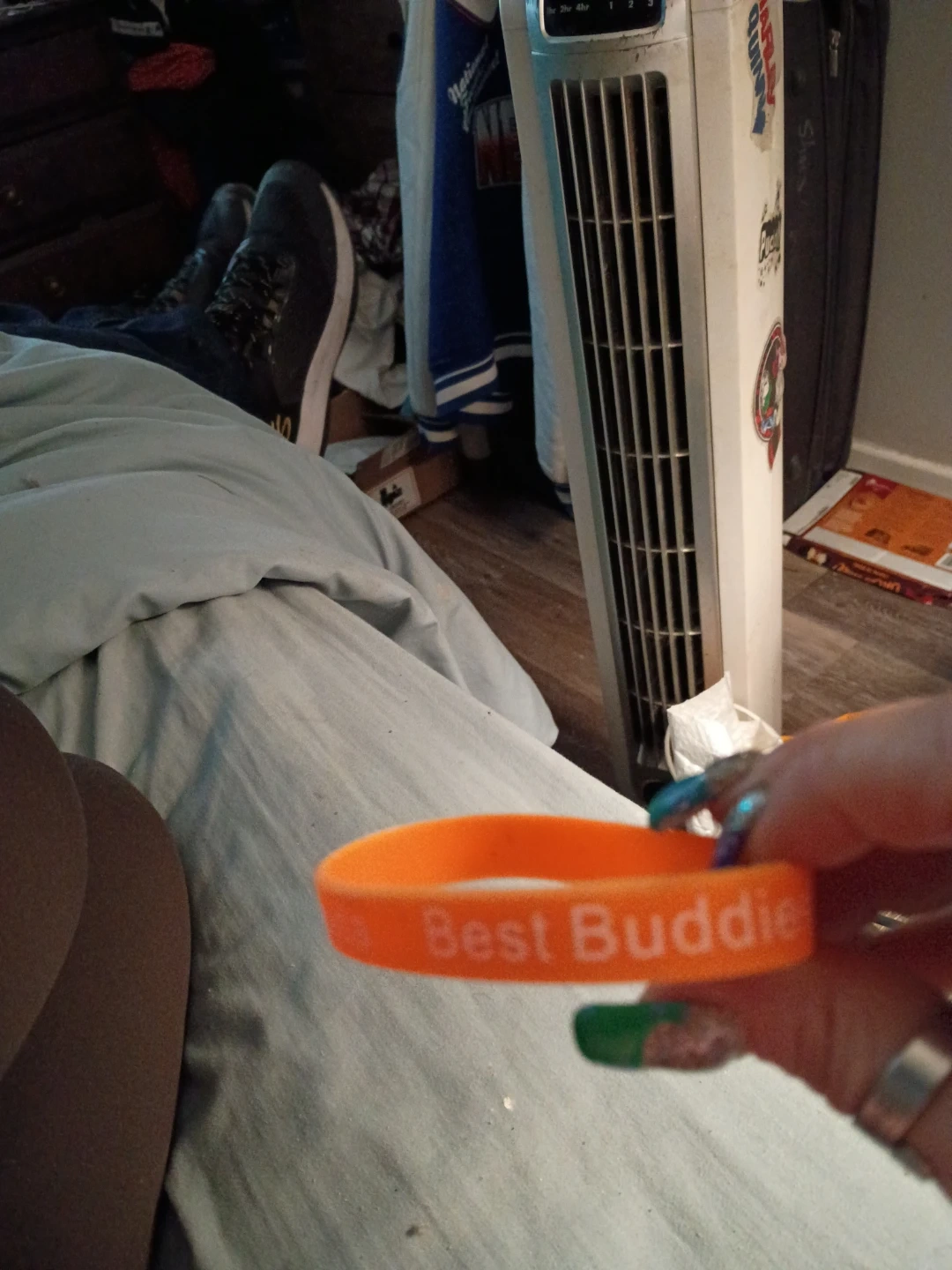 This is an orange silicone bracelet that says "Best Buddies" on it. It's a fun accessory for friends. The material is silicone.