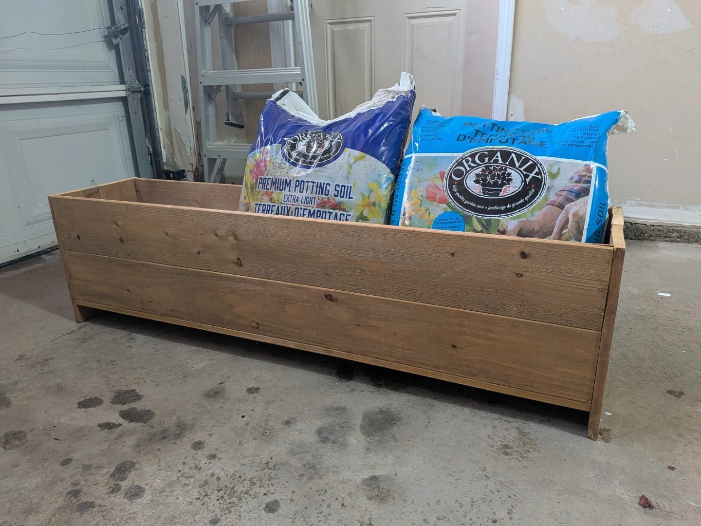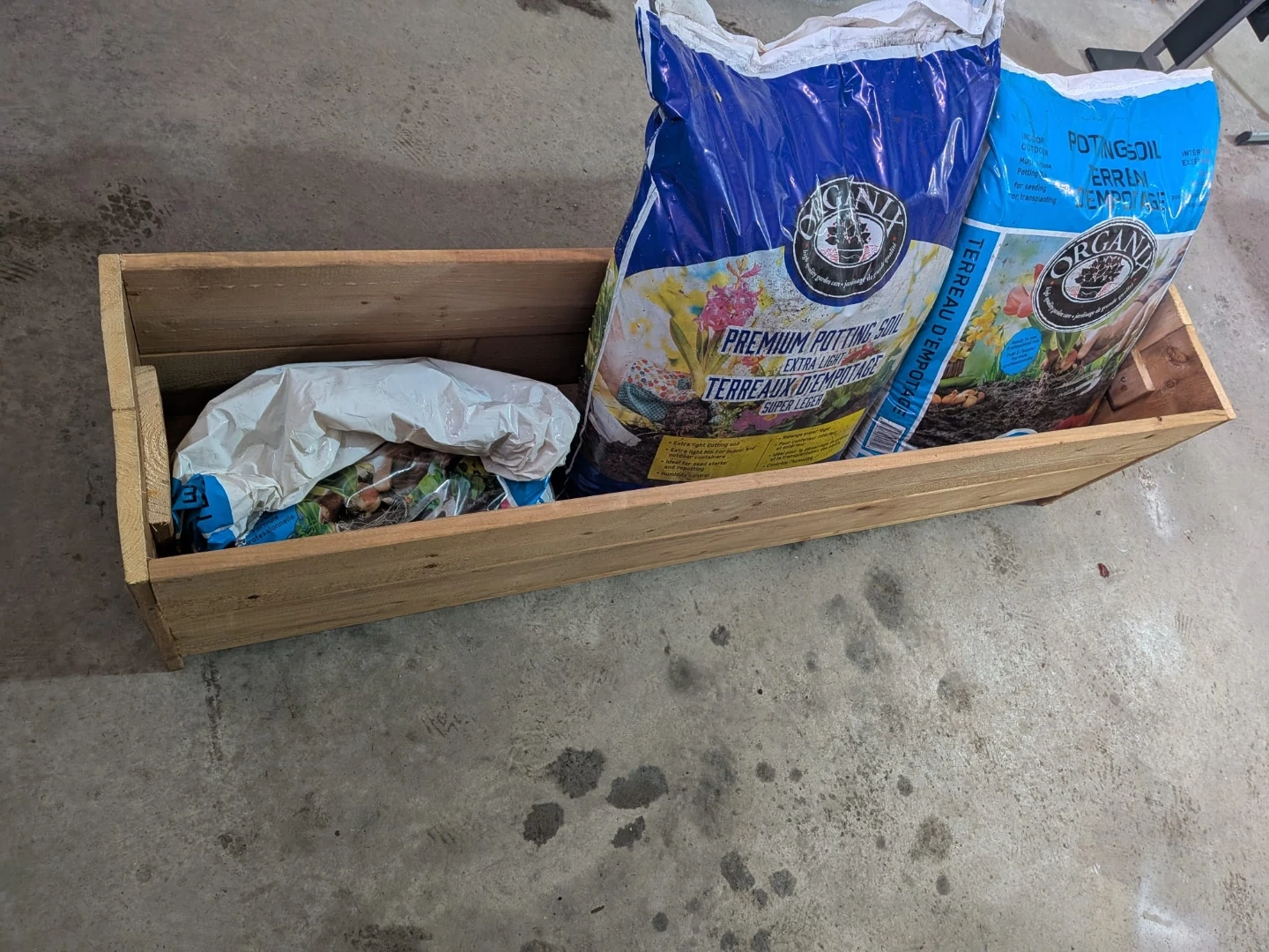This is a wooden planter box. It includes two bags of premium potting soil. Perfect for your garden projects!